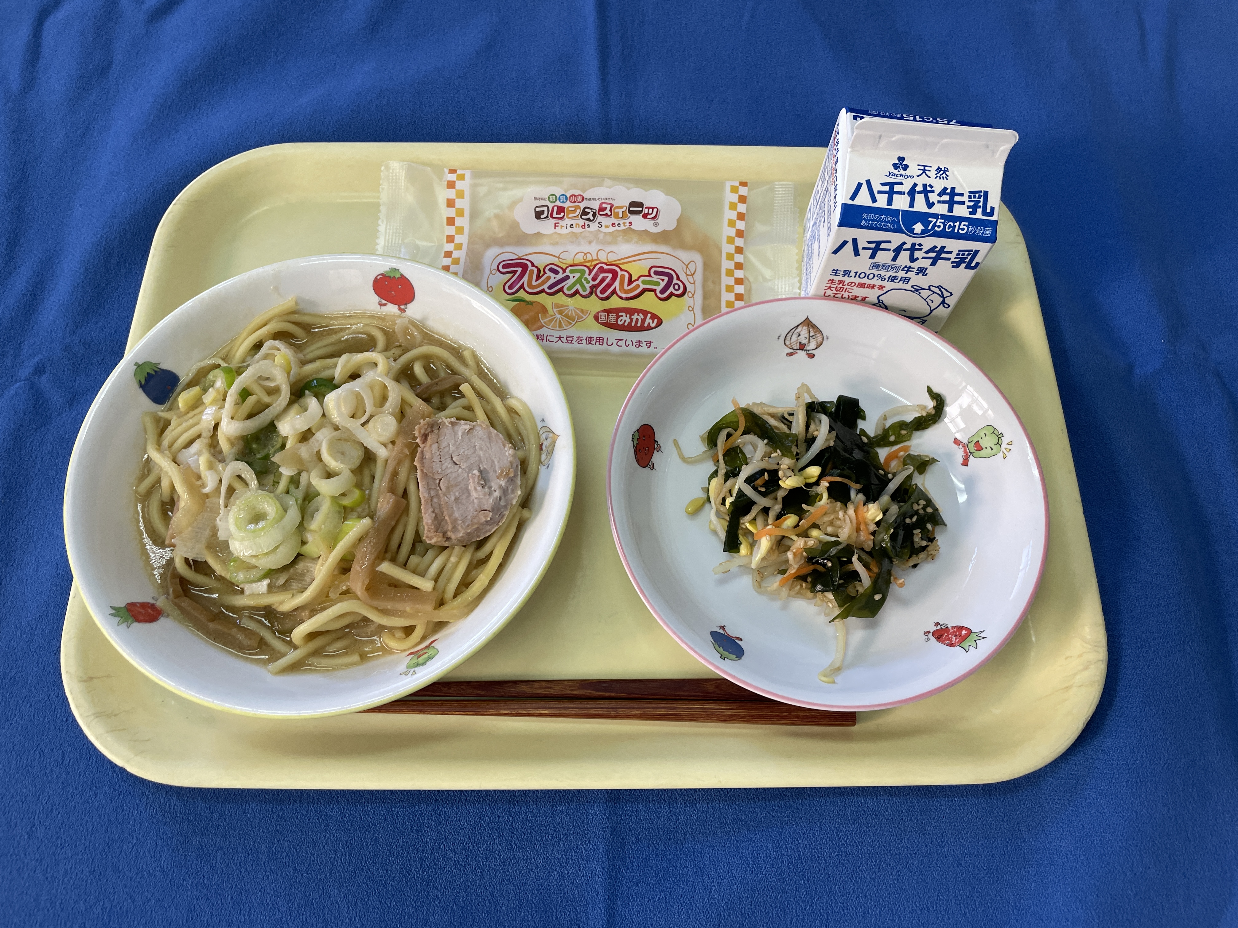 みそラーメン 手作りチャーシュー 切り干しのナムル みかんクレープ 牛乳 |