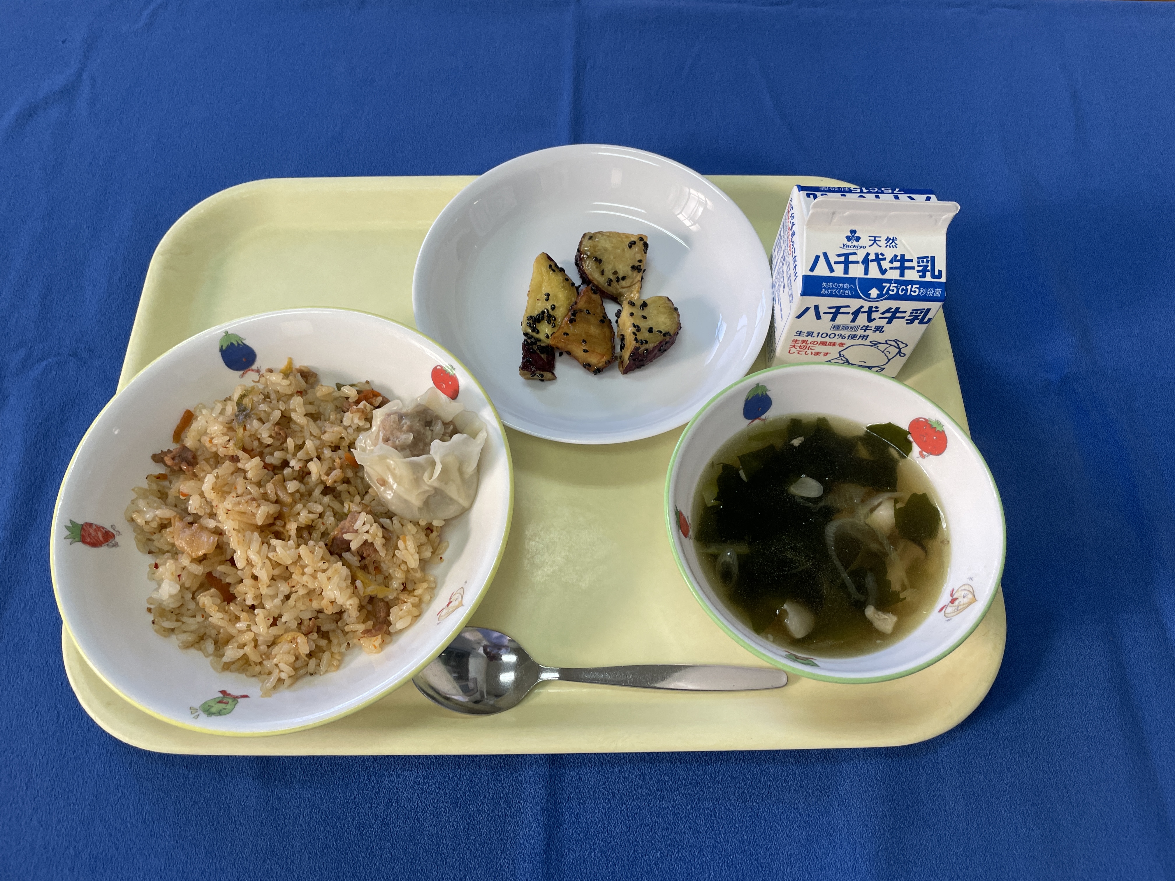 キムチごはん 手作りしゅうまい わかめスープ 大学芋 牛乳 |