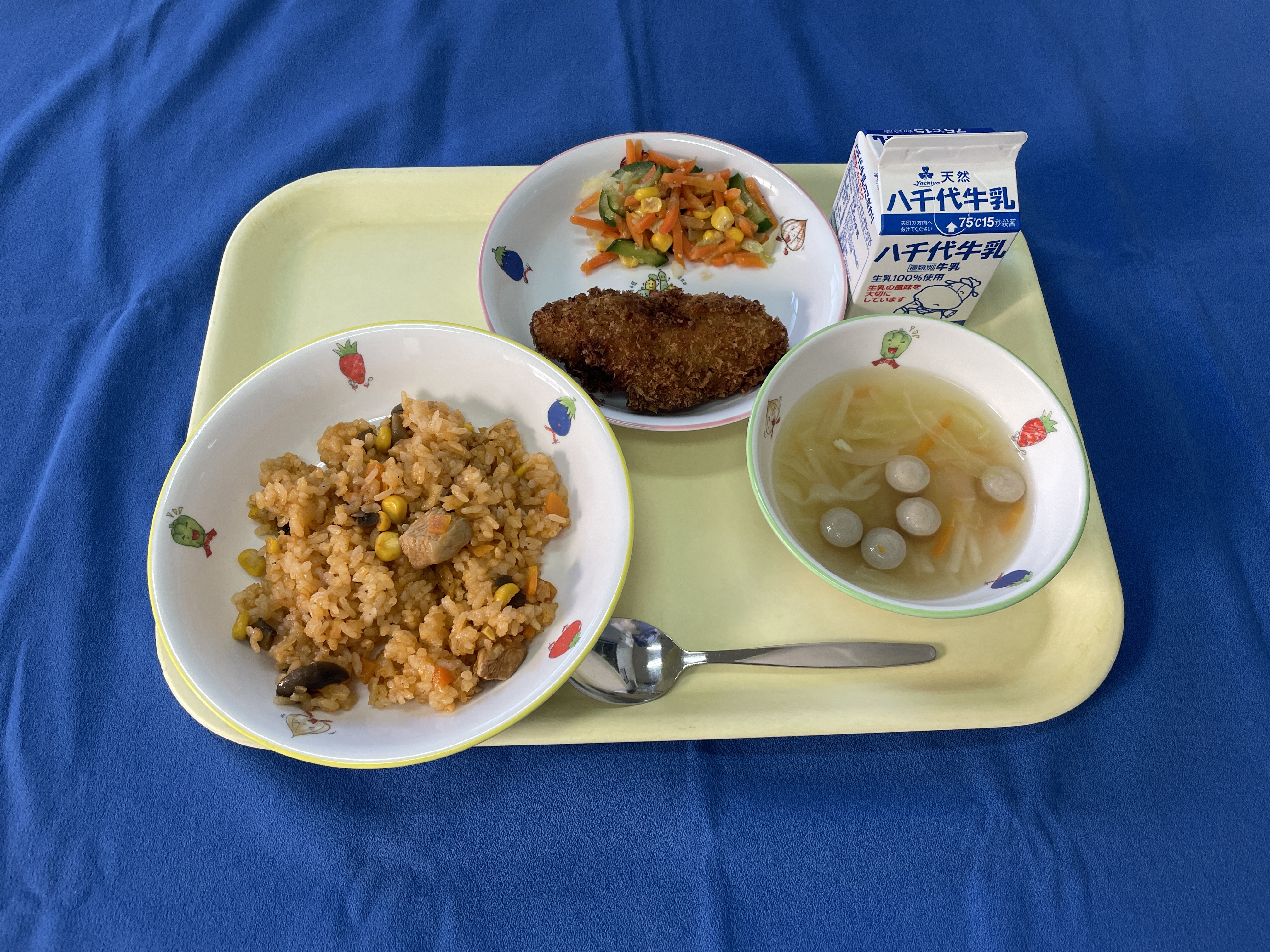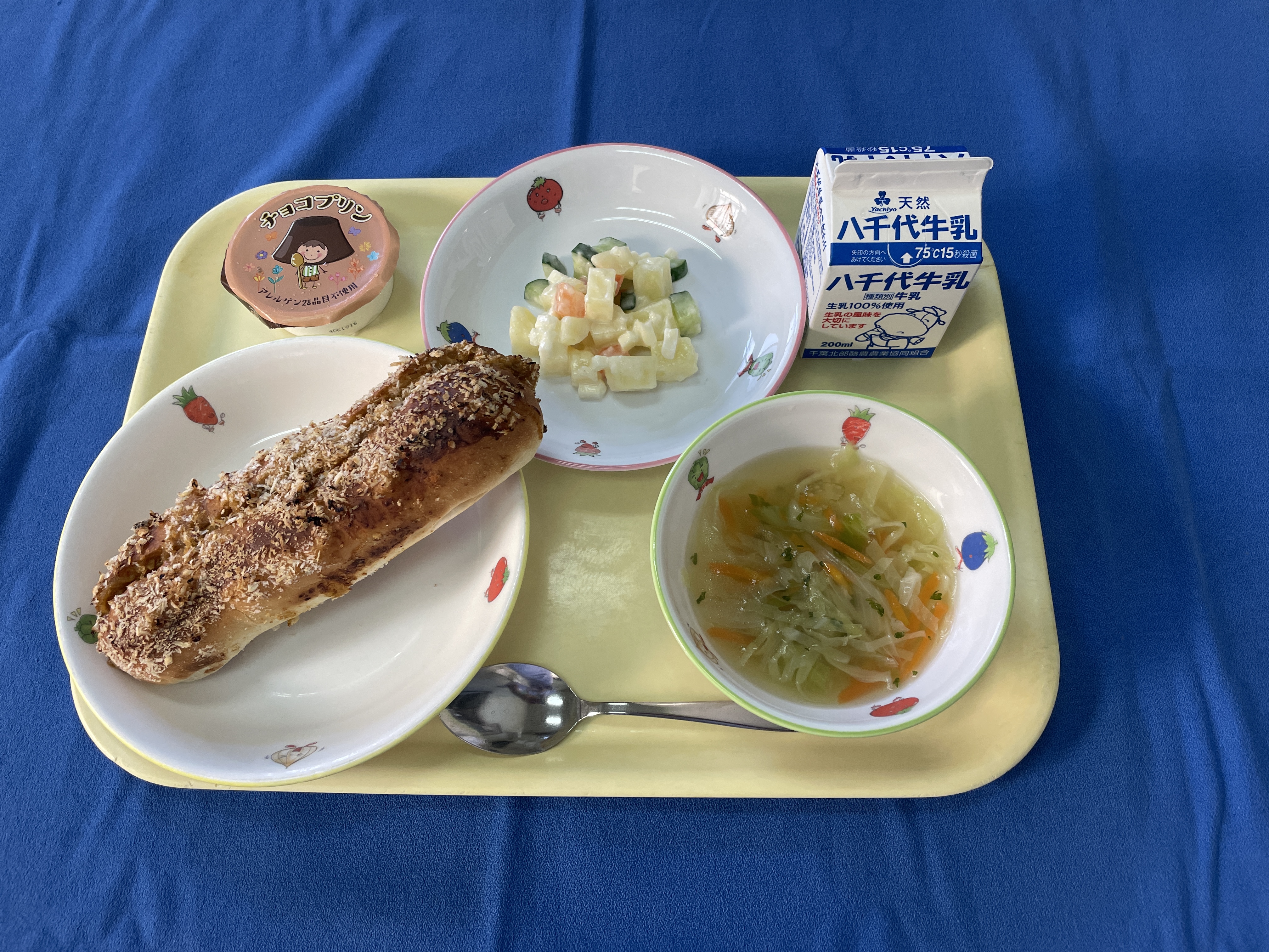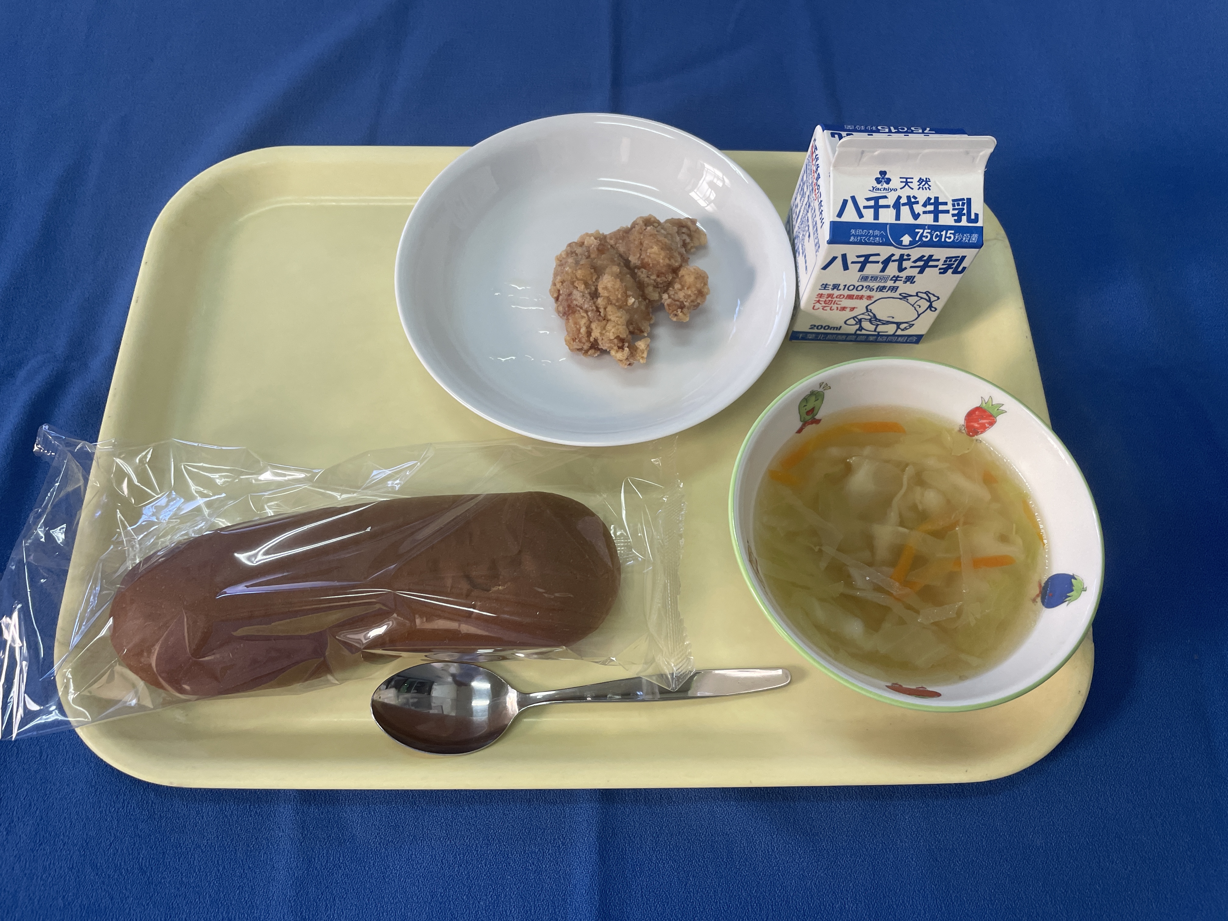 黒糖パン 鶏のから揚げ ABCスープ 牛乳 本日は就学時健診のため、簡単に食べられる献立でした。 |