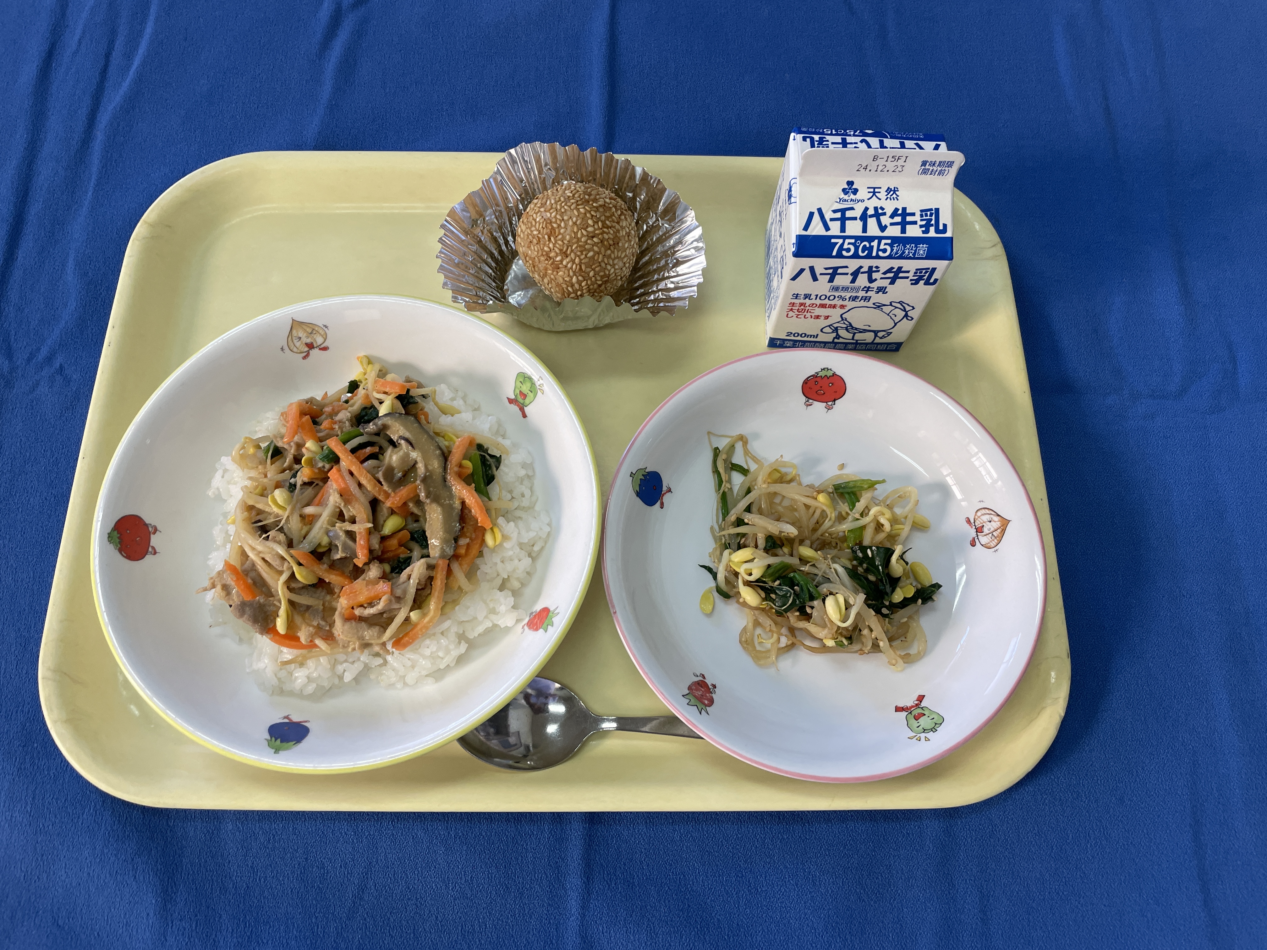 麦ごはん 韓国風すきやき丼 もやしのナムル ごまだんご 牛乳 |