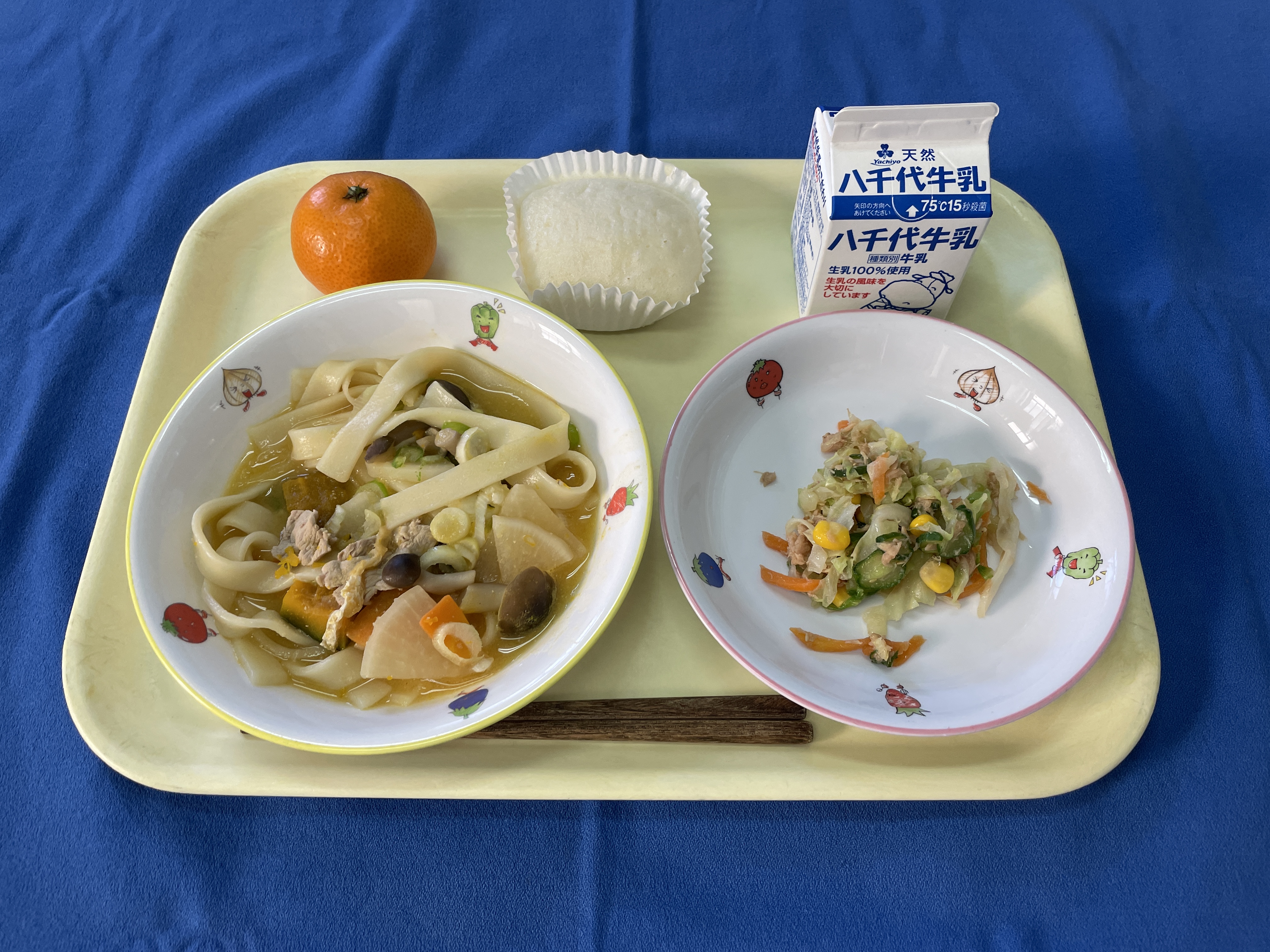 ほうとう ツナサラダ 手作り肉まん みかん 牛乳 |