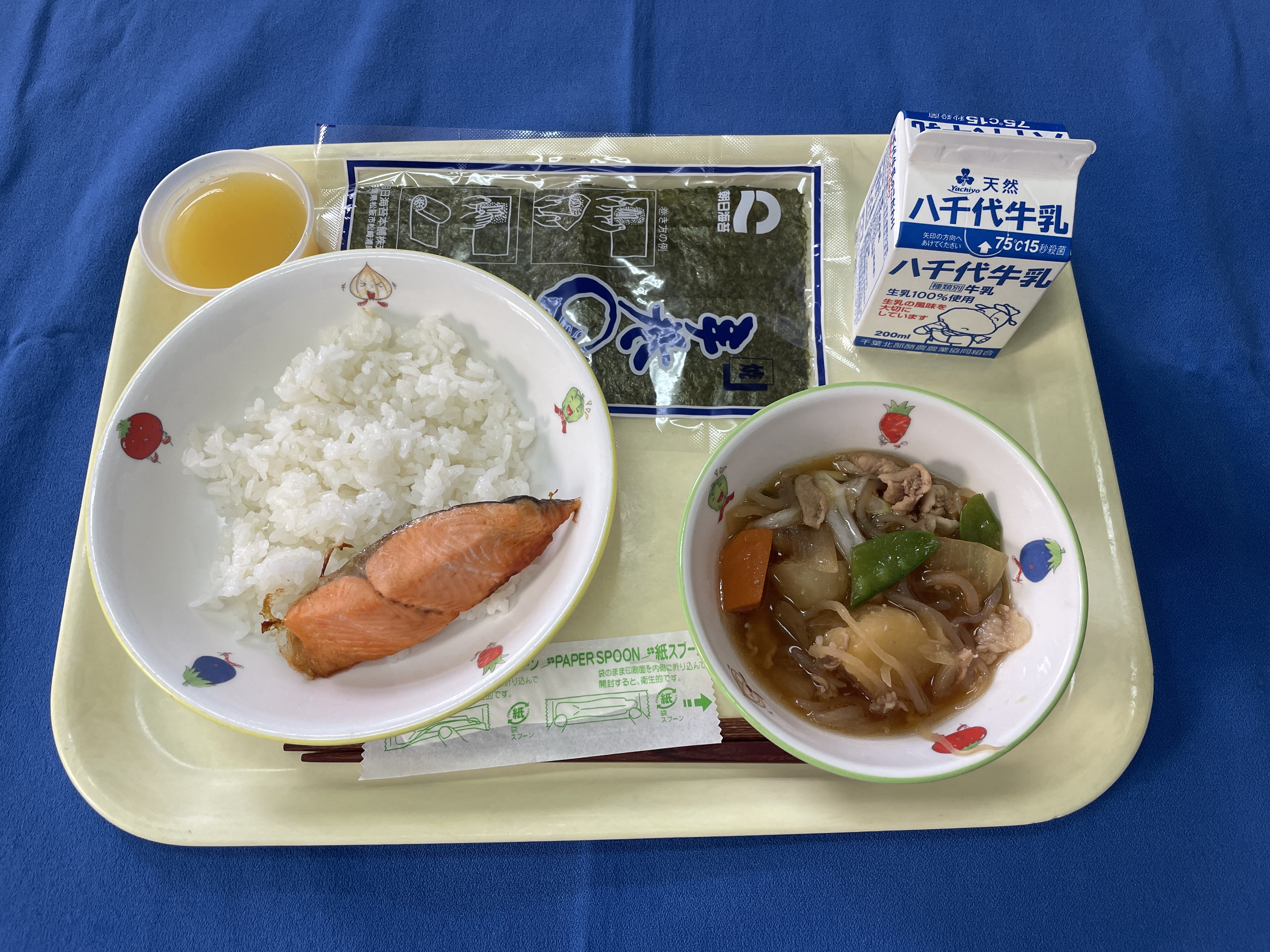 ご飯 のりの佃煮 塩鮭 ごぼうとひじきのサラダ 性学もち入り味噌汁 牛乳 今日は、市川でとれたのりを佃煮にしました。 風味豊かなのりは、白いご飯とよく合います。 |