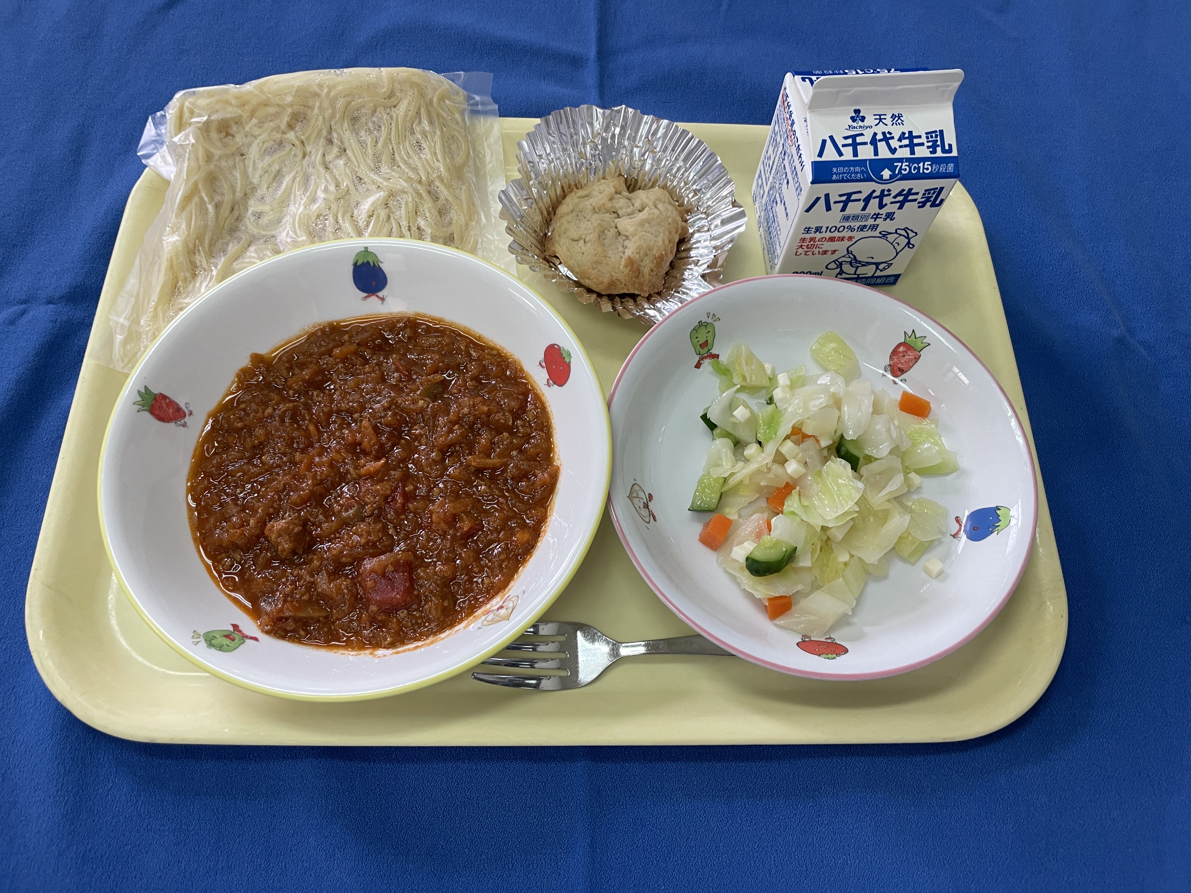 【おはなし給食】 スパゲッティ ミートソース イタリアンサラダ メイプルシロップクッキー 牛乳 11月18日~12月6日は読書月間です。 給食では、給食委員が選んだ本に登場する料理を再現する「おはなし給食」を実施します。 第一弾は、「おかしな国のお菓子の本」に登場する「メイプルシロップクッキー」を提供しました。 |