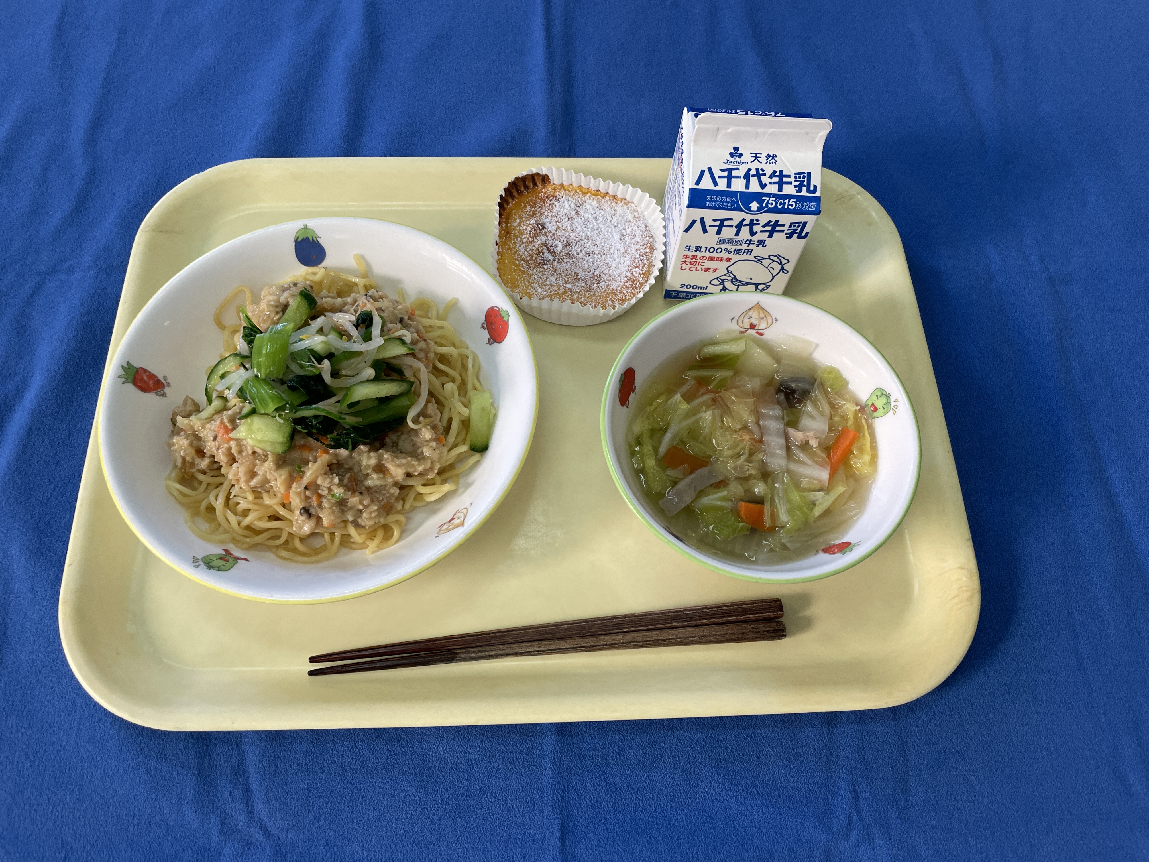 豚肉と小松菜のスパゲッティ コーンとささみのサラダ ガルバンゾのパイ 牛乳 |