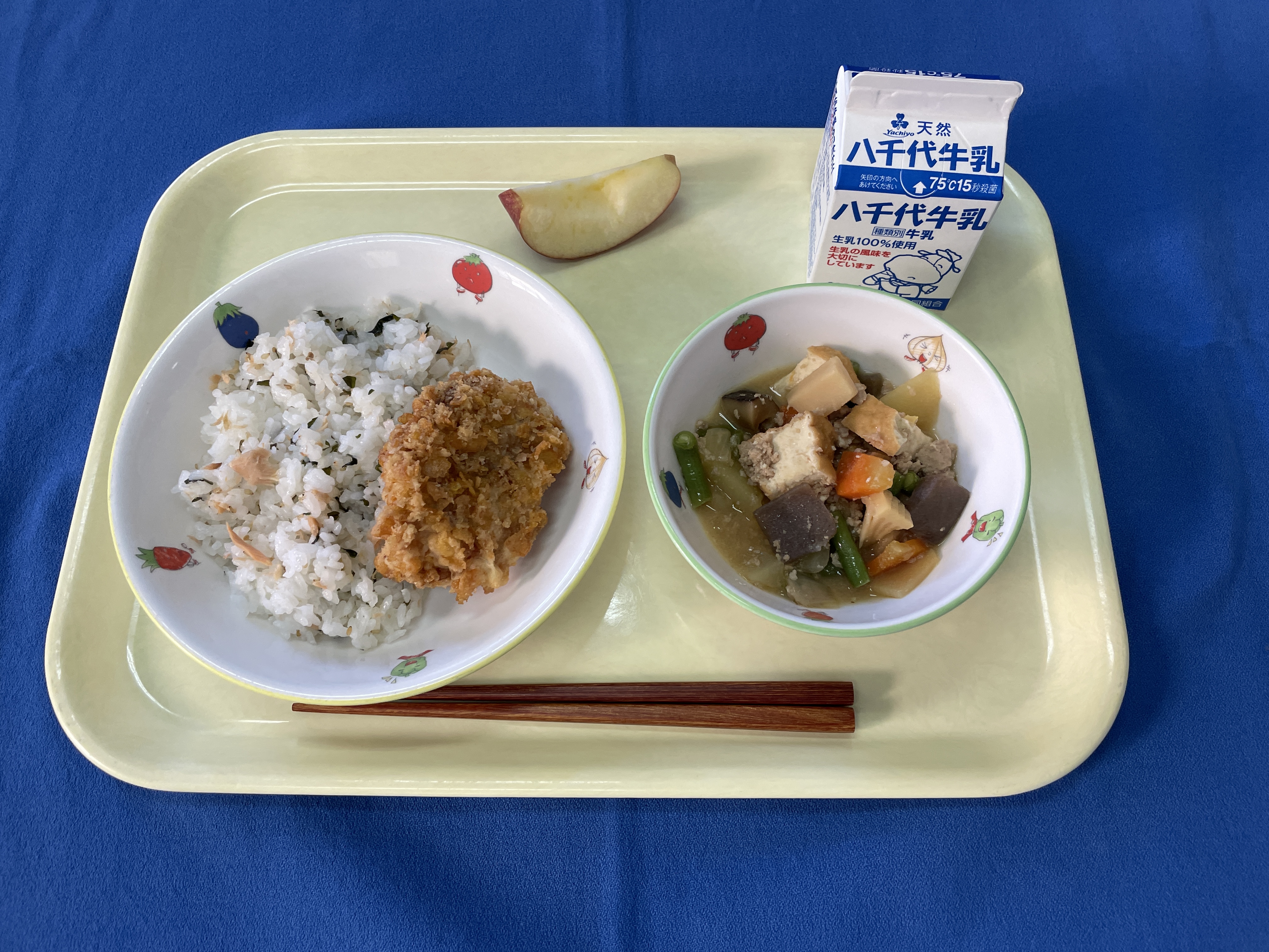 鮭わかめご飯 鶏肉のコーンフレーク揚げ 生揚げの肉味噌煮 りんご 牛乳 |
