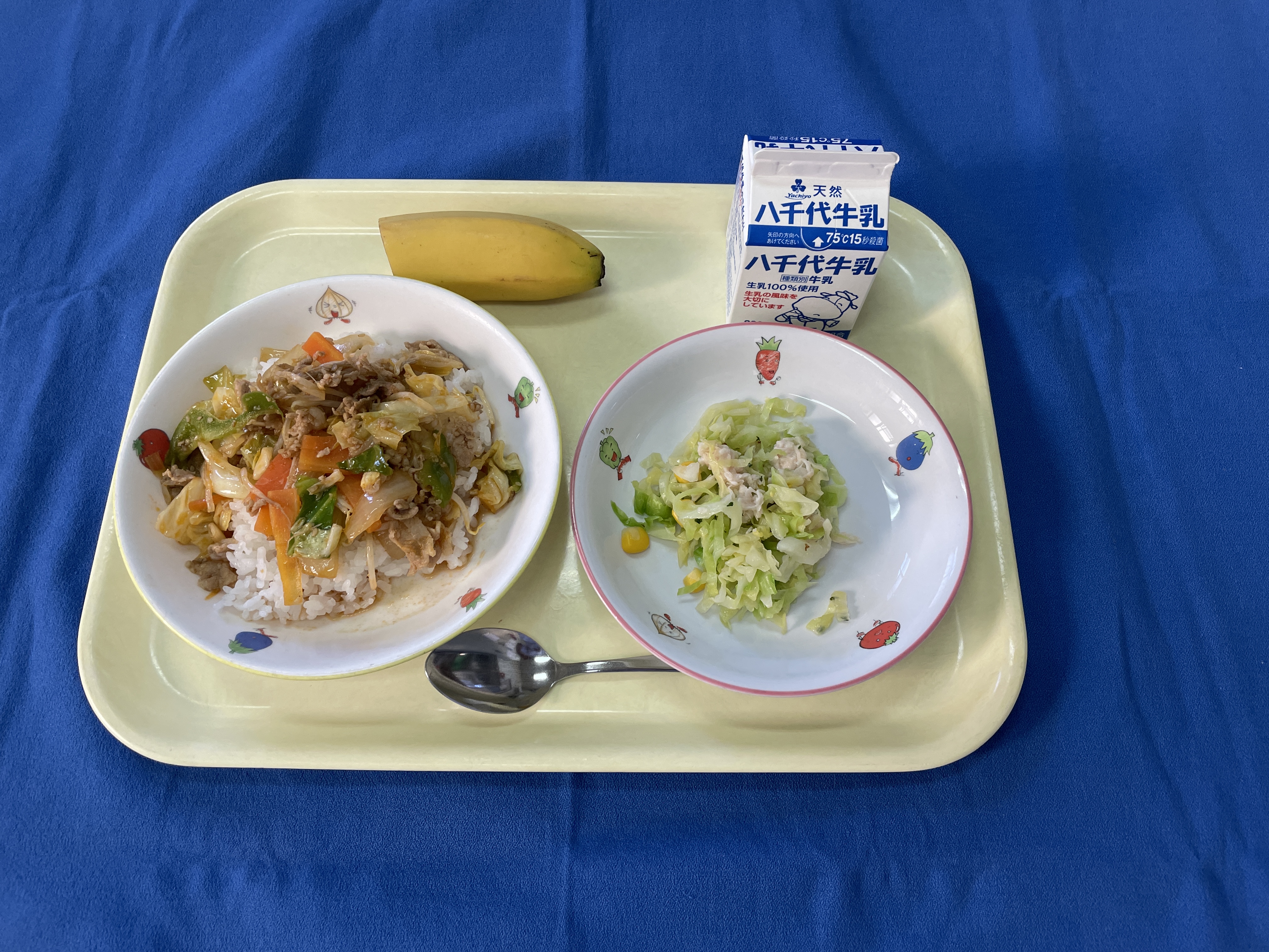 ご飯 焼肉丼 コールスローサラダ バナナ 牛乳 |