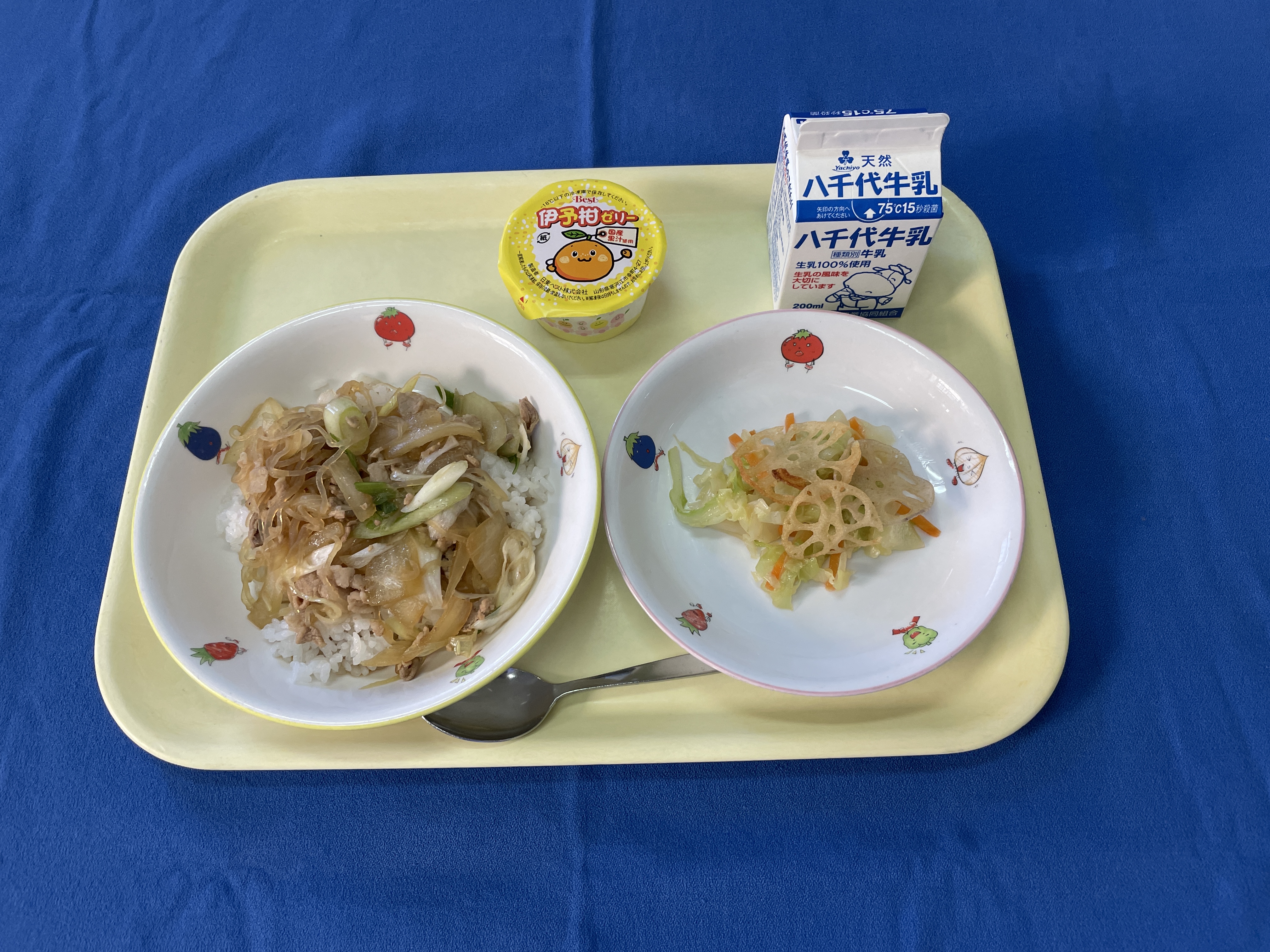 麦ごはん 豚丼 れんこんサラダ いよかんゼリー 牛乳 |