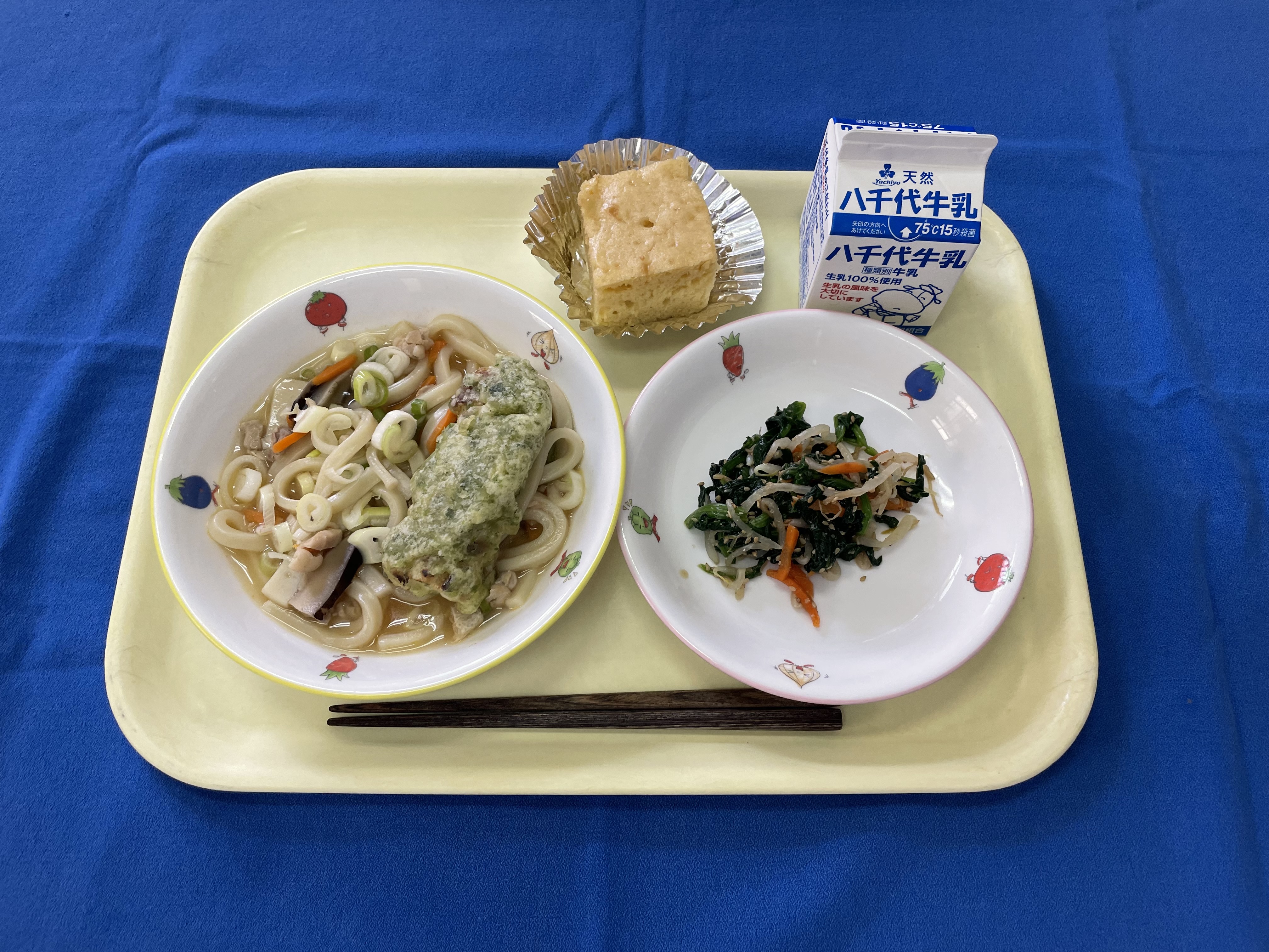 【おはなし給食】 煮込みうどん ちくわの磯部揚げ ごまあえ ぐりとぐらのカステラ 牛乳 今日は、「ぐりとぐら」に登場するカステラを提供しました。 |