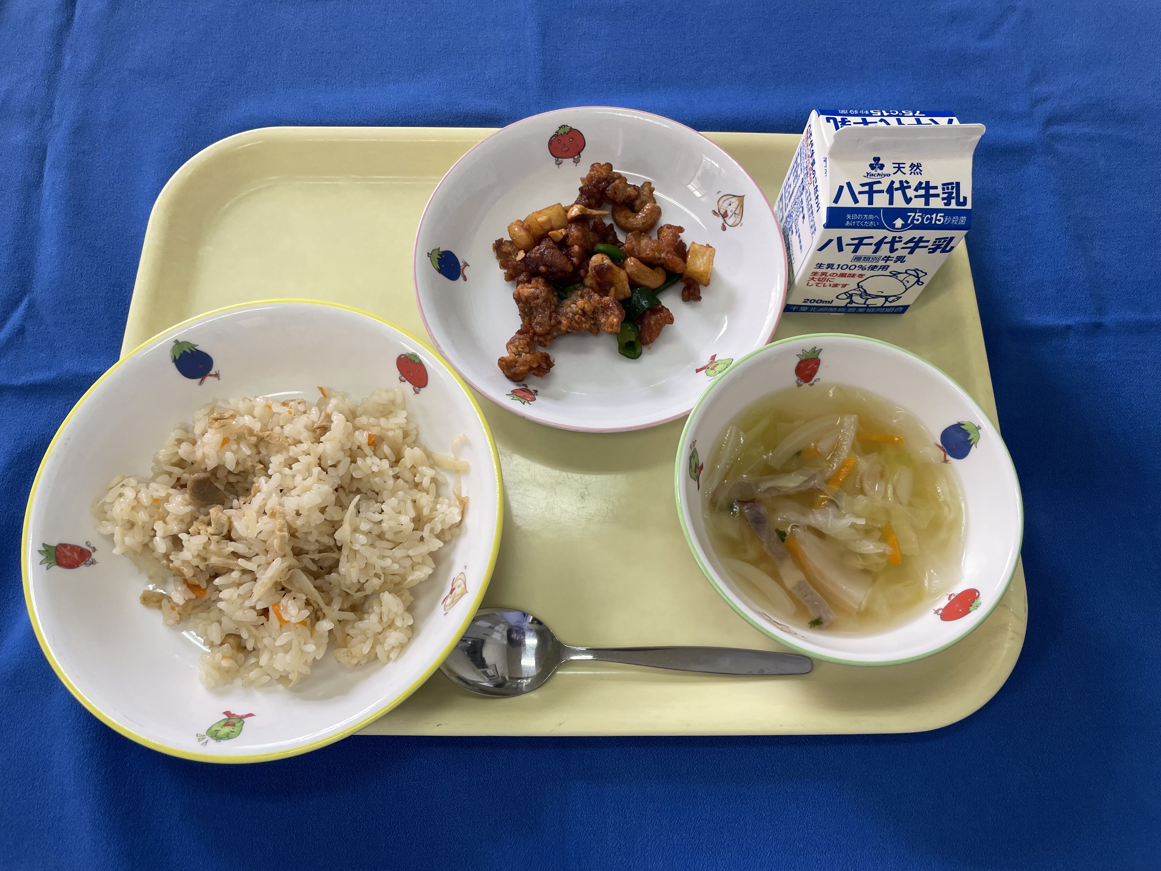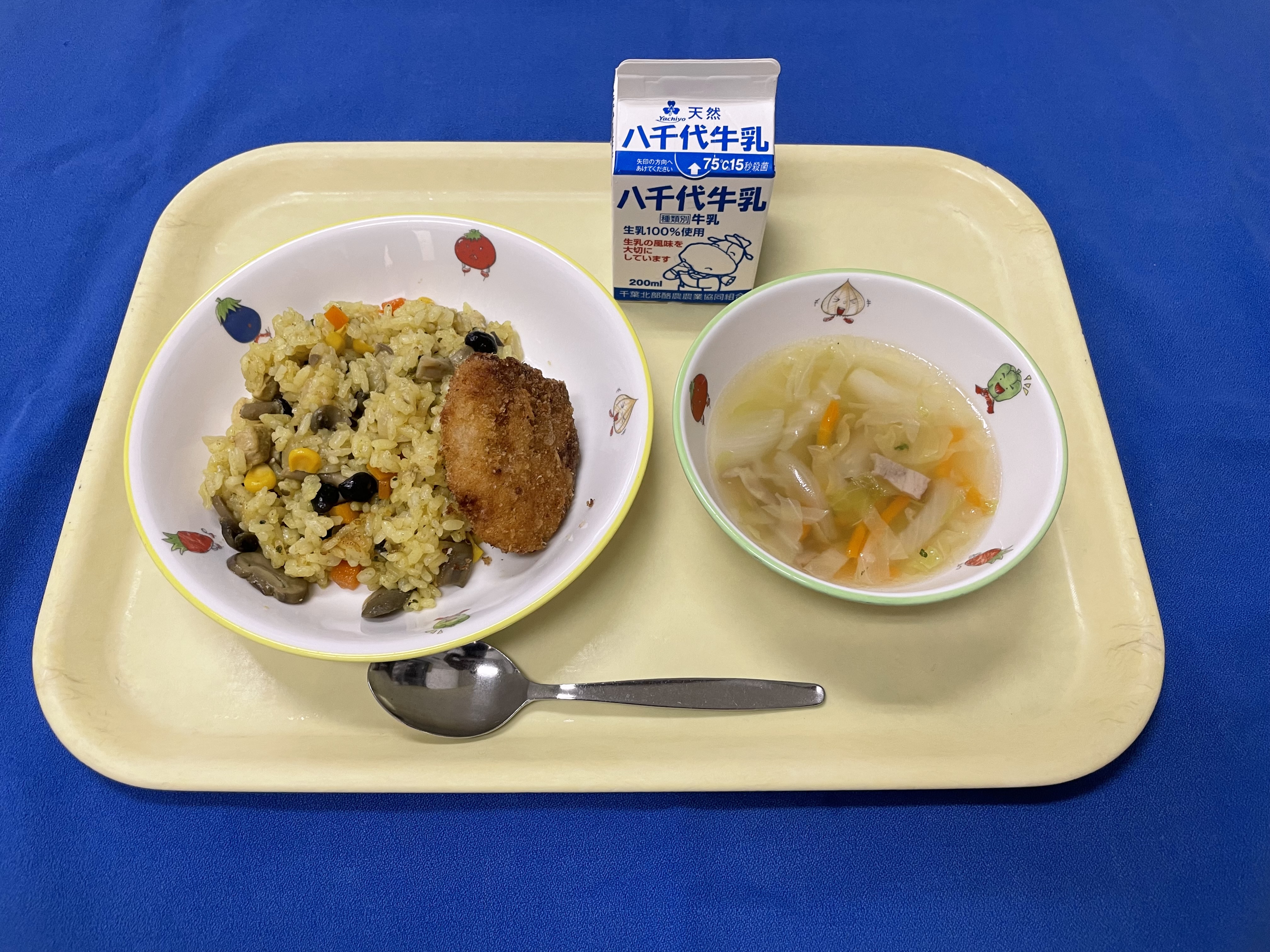 牛乳(千葉) 米(千葉) 人参(千葉/銚子) キャベツ(千葉/松戸) きゅうり 大根(青森/十和田) 玉ねぎ(千葉/長生) じゃがいも(長崎/雲仙) 豚ひき肉(千葉) |