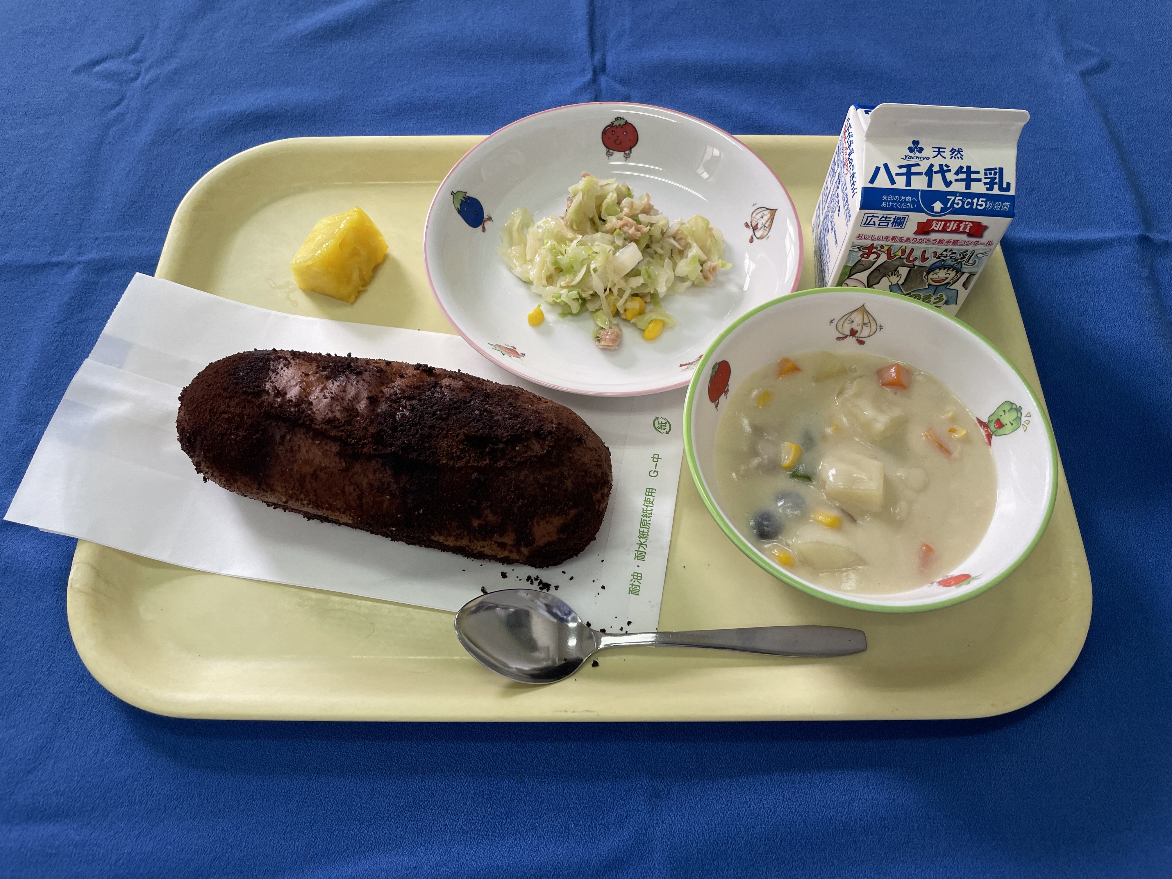 ココア揚げパン コールスローサラダ クリームシチュー パイン 牛乳 揚げパンは、ココア味が好きだと教えてくれた児童が多かったです。 クリームシチューにはアスパラガスを入れました。下茹でして入れることで食べやすくなります。 |