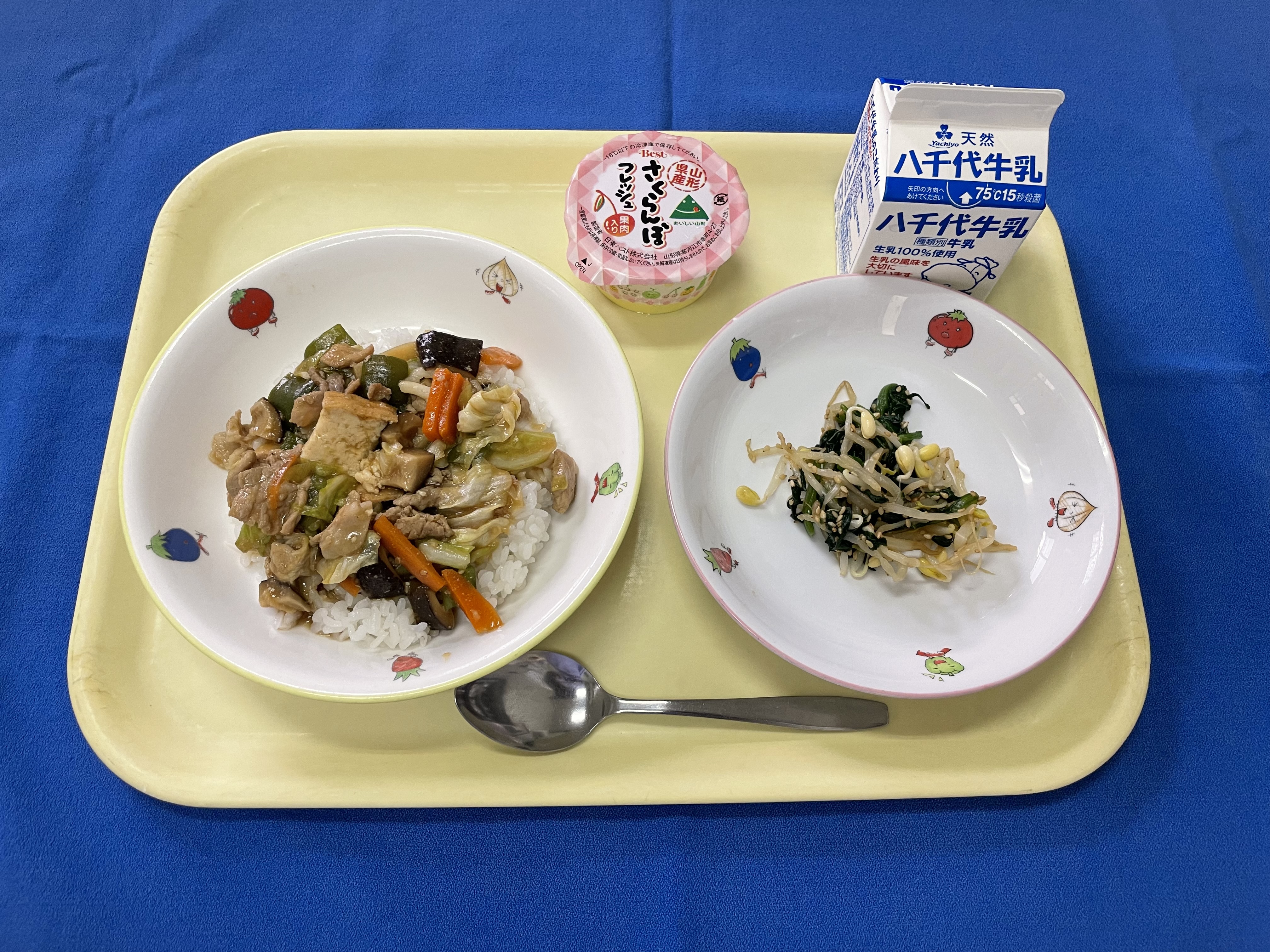 麦ご飯 ホイコーロー もやしのナムル さくらんぼゼリー 牛乳 |