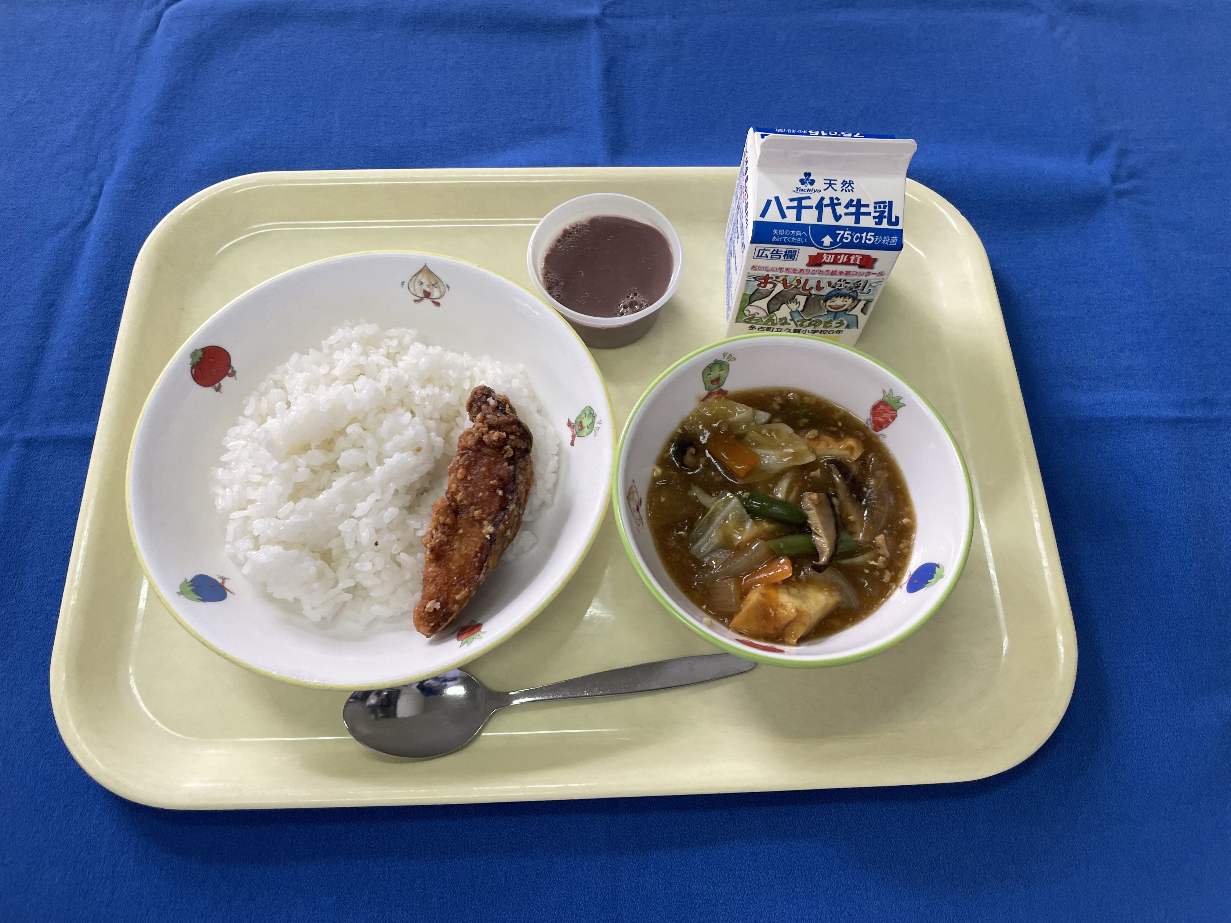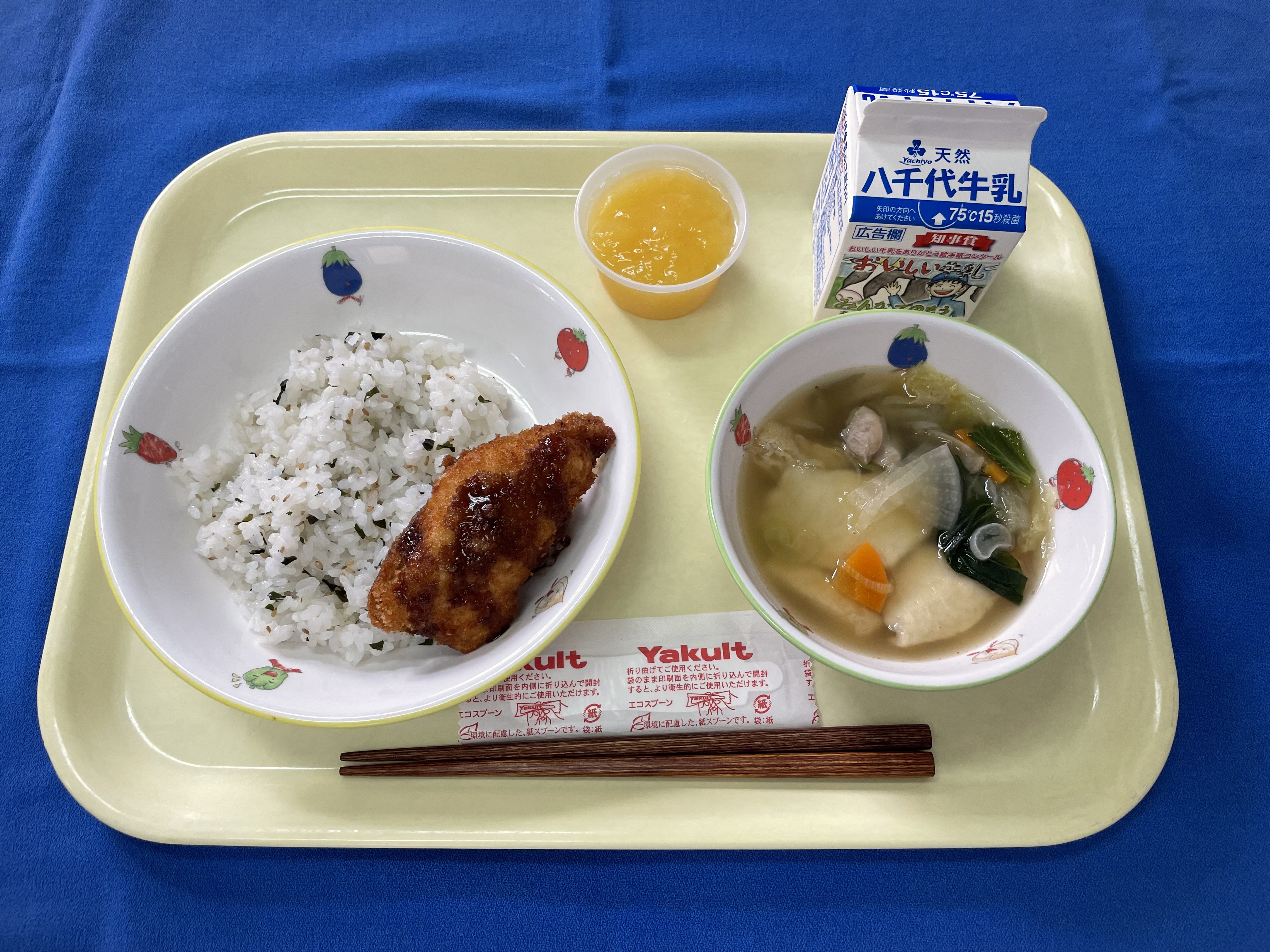 牛乳(千葉) 米(千葉) ごぼう(青森/十和田) 人参(千葉/船橋) 玉ネギ(兵庫/淡路) みつ葉(千葉) 豚もも肉(千葉) 鶏もも肉(岩手) |