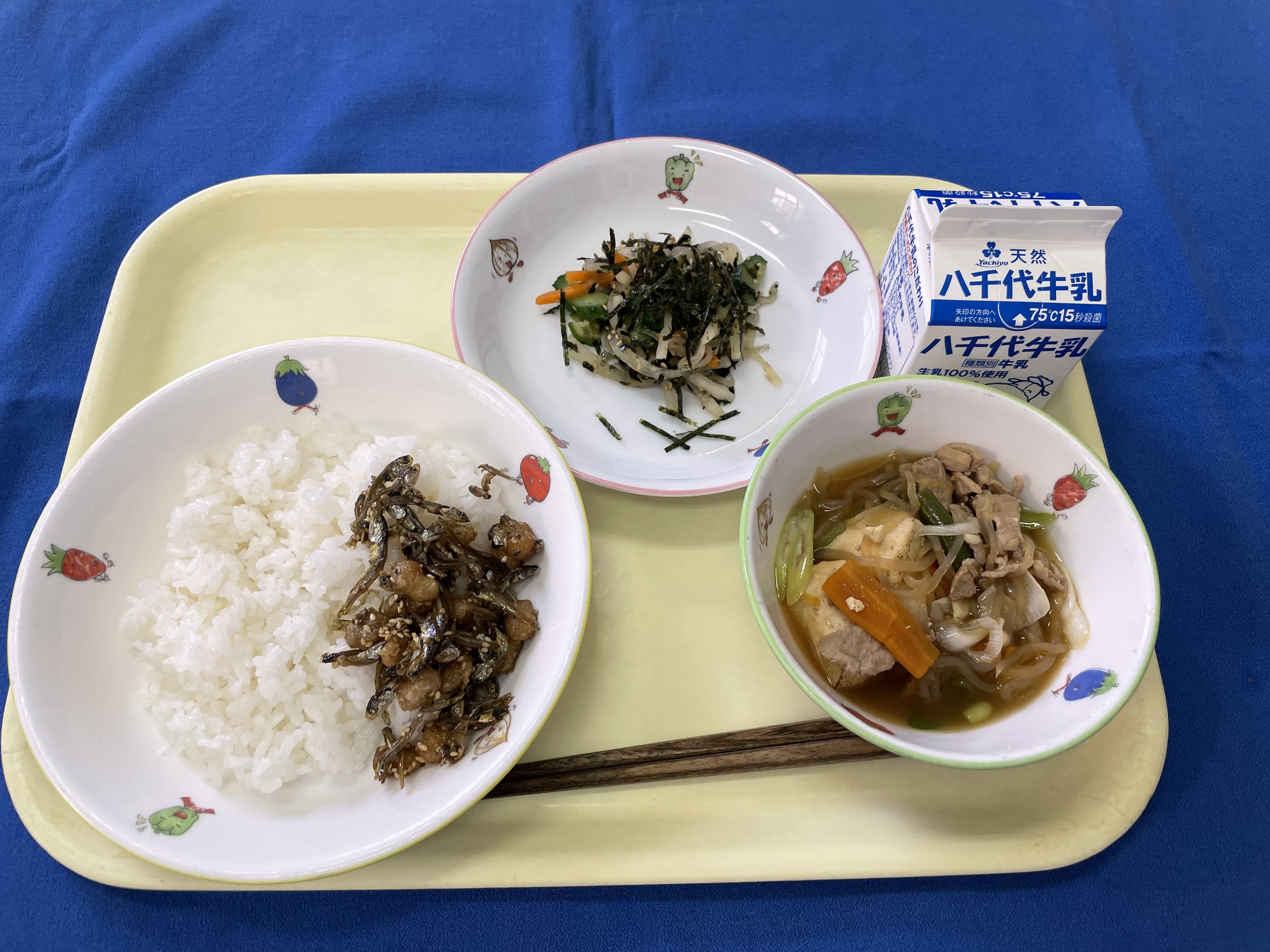 ご飯 義助煮 じゃこと大根サラダ 肉豆腐 牛乳 義助煮は、揚げた煮干しと大豆に、甘じょっぱいタレを絡めたものです。 よく噛んで食べられる献立です。 |