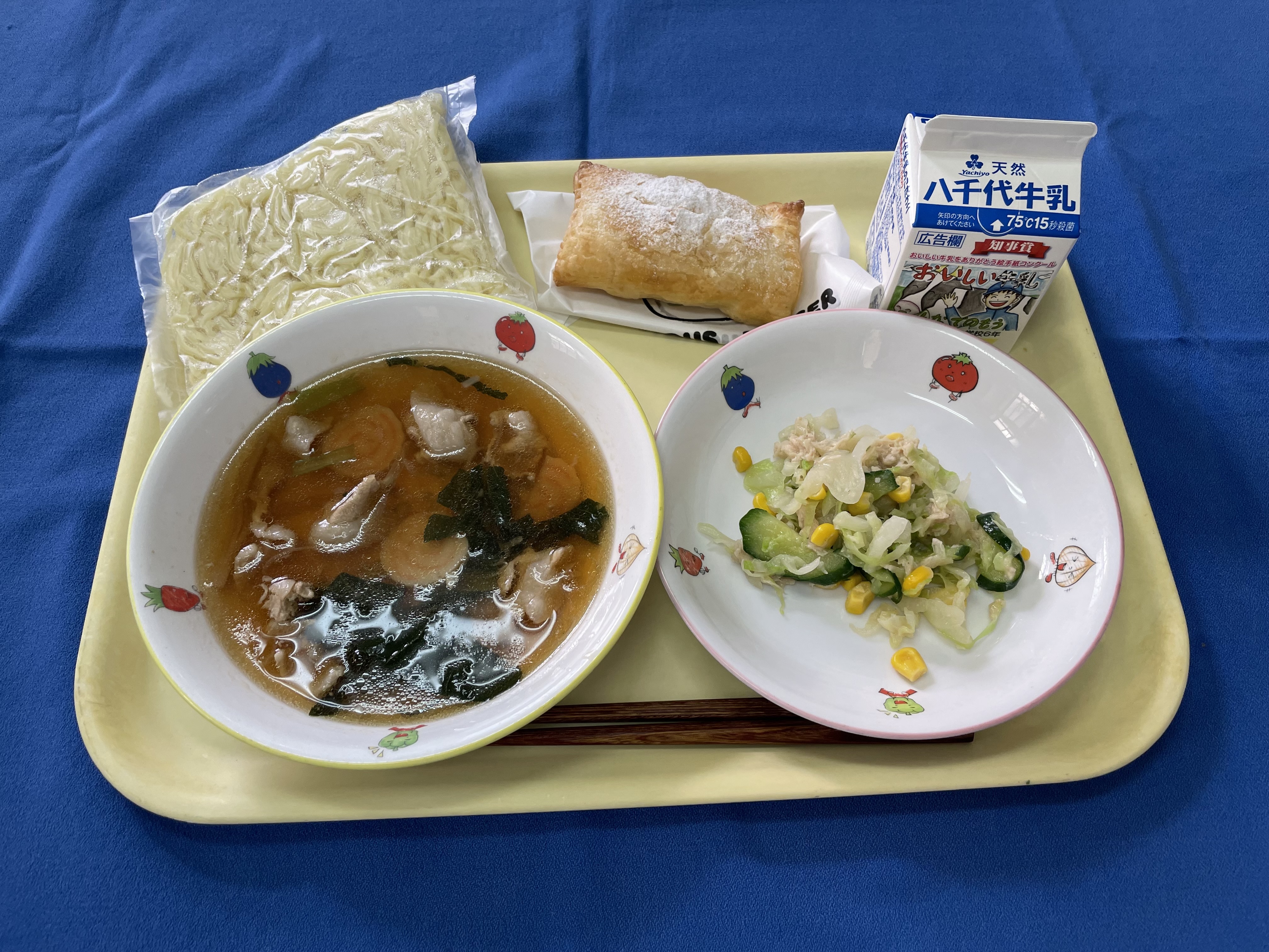 しょうゆラーメン コーンとささみのサラダ ガルバンゾのパイ 牛乳 |