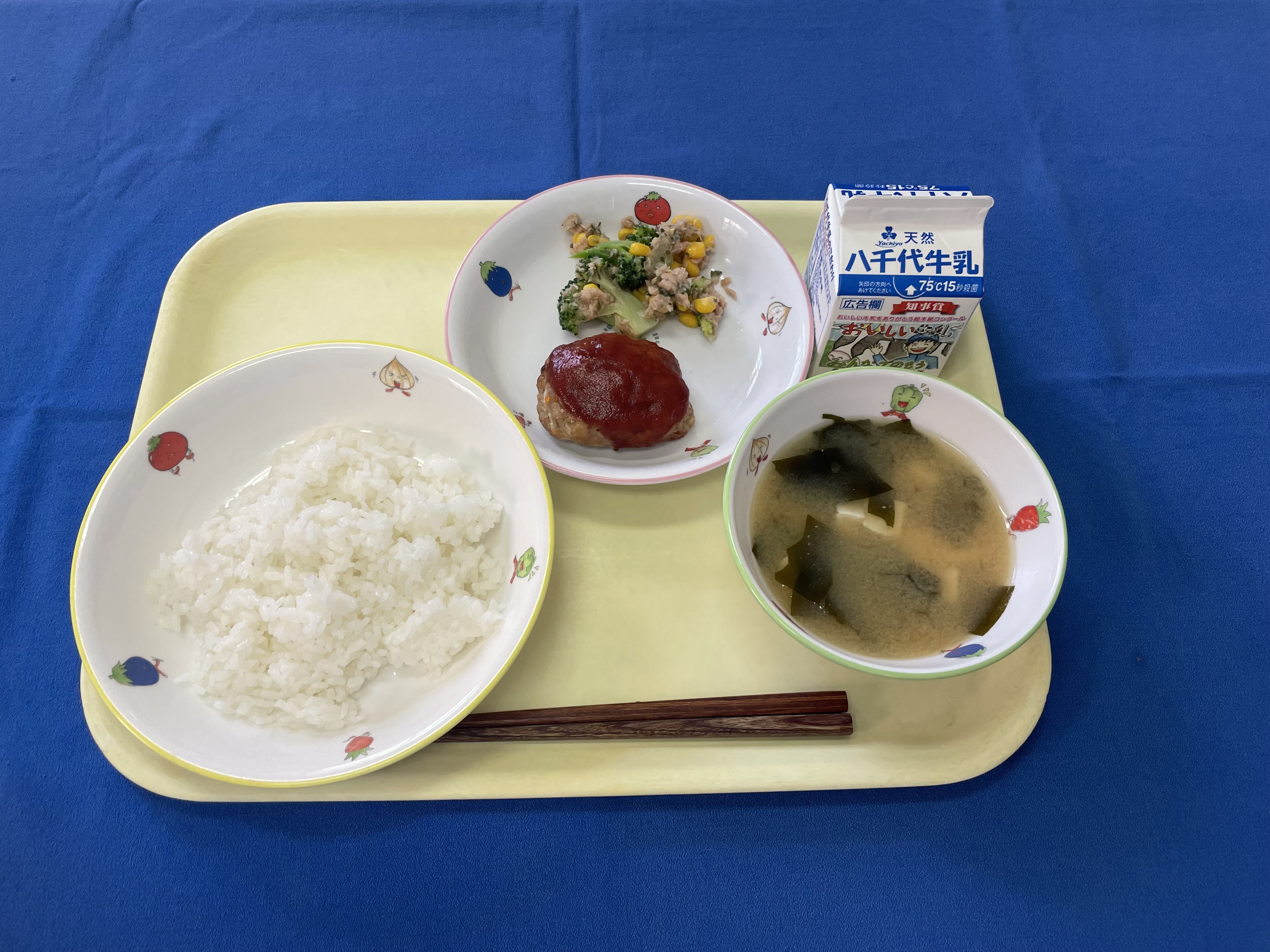 ご飯 ハンバーグ ブロッコリーとツナのサラダ なめこ汁 牛乳 |