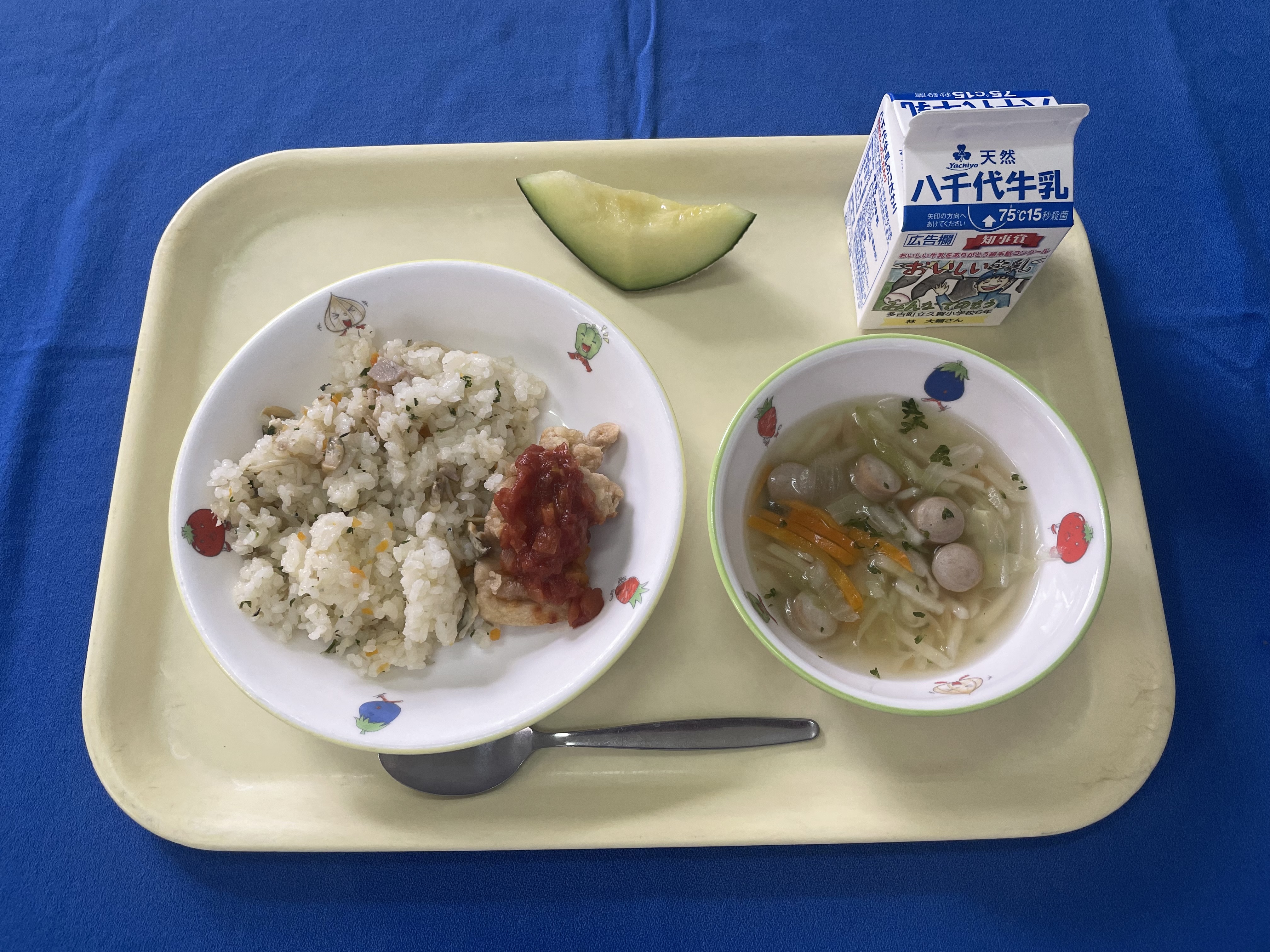ボンゴレガーリックライス 鶏肉のメキシカンソース ウインナーポテトスープ メロン 牛乳 |