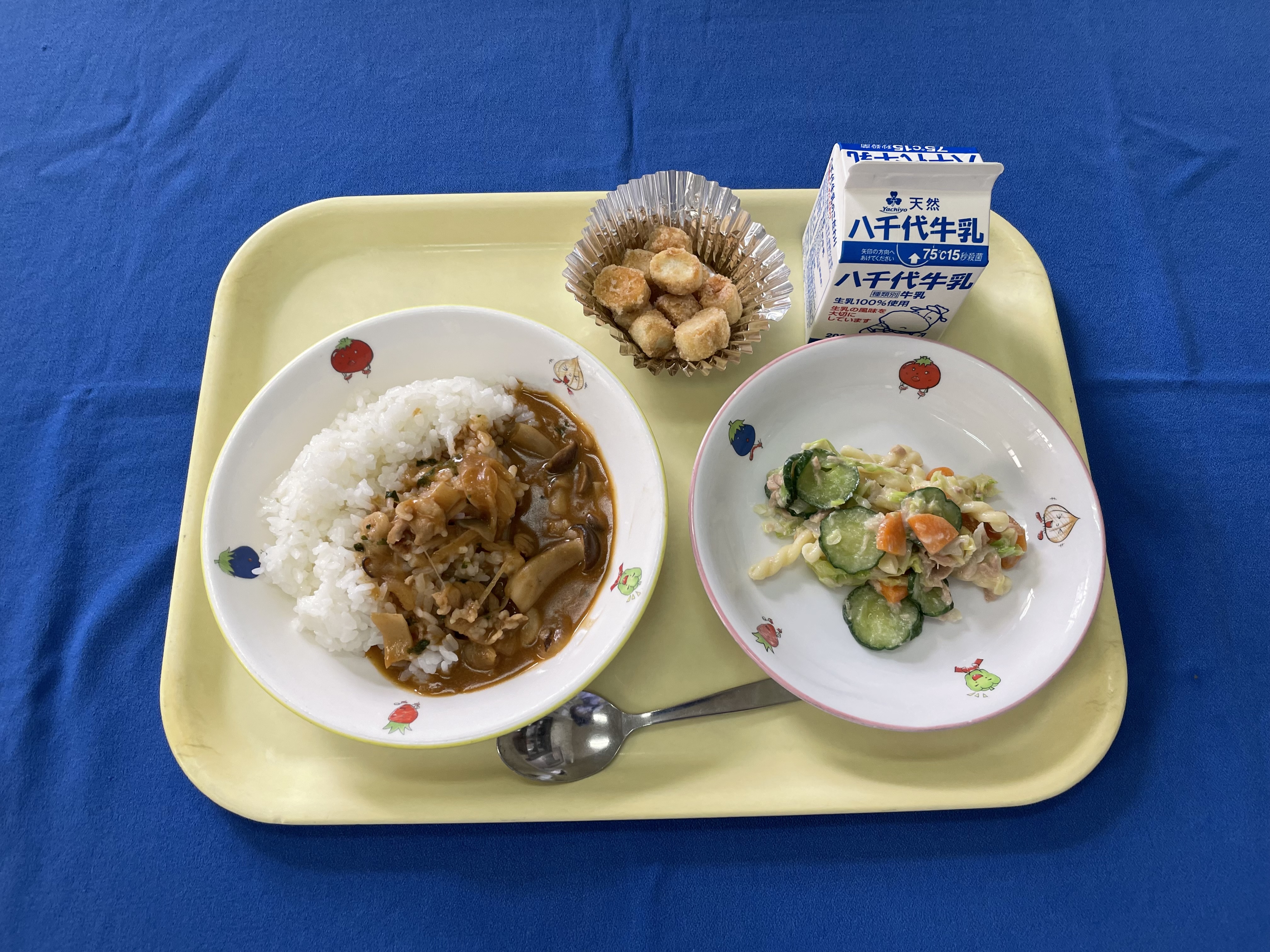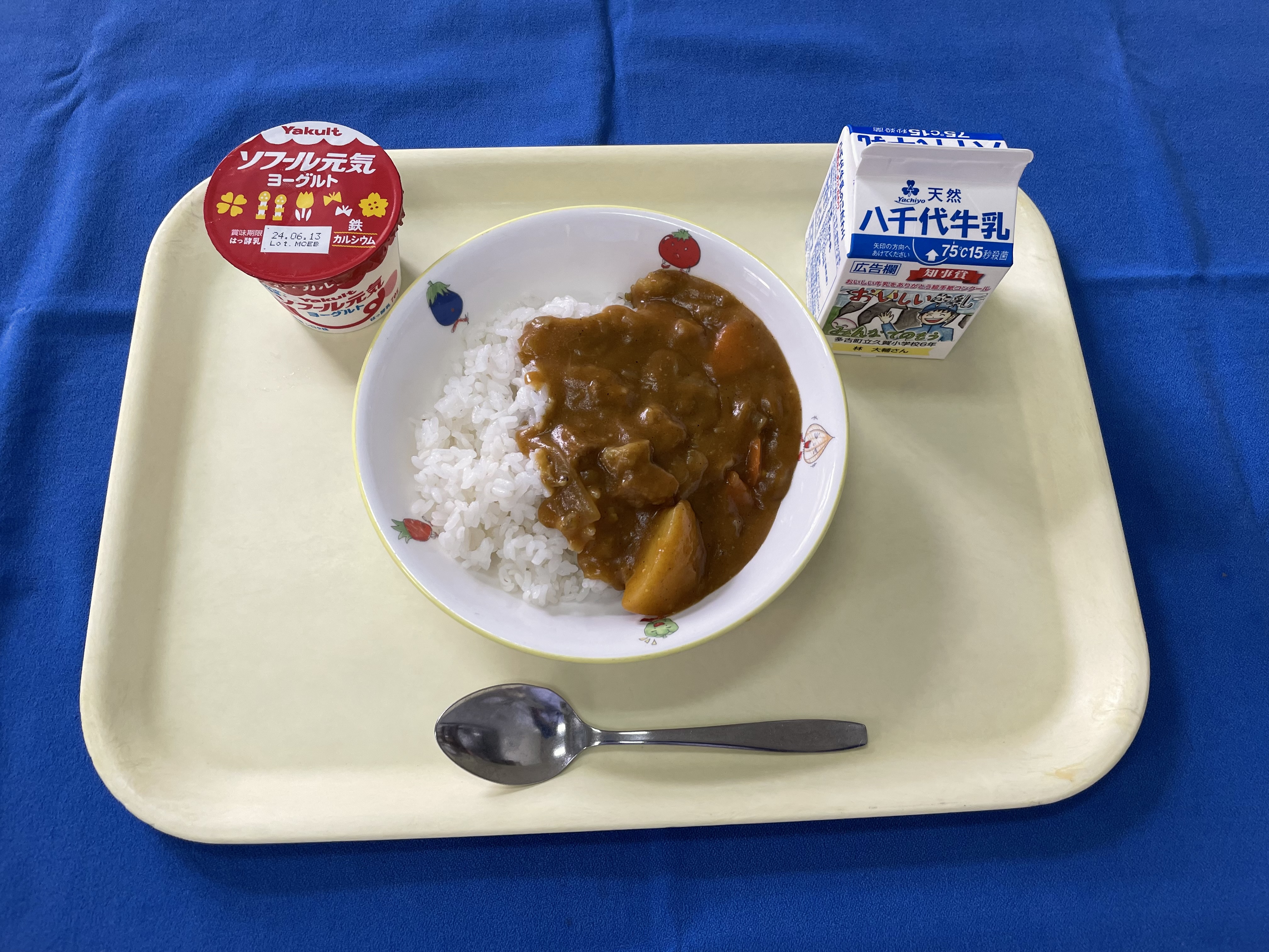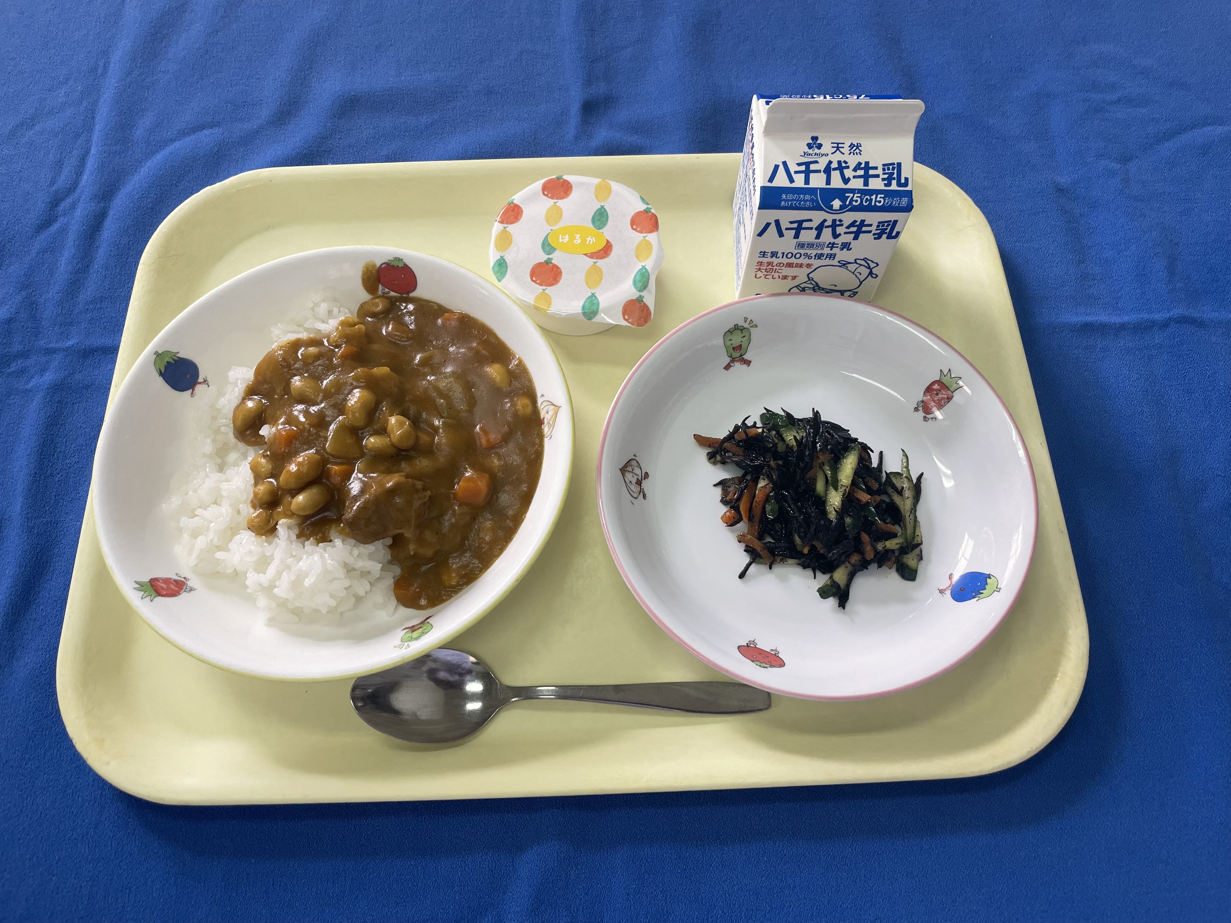 麦ごはん ポークカレー ヨーグルト 牛乳 今日は運動会予備日のため、簡単に配膳出来る献立でした。 |