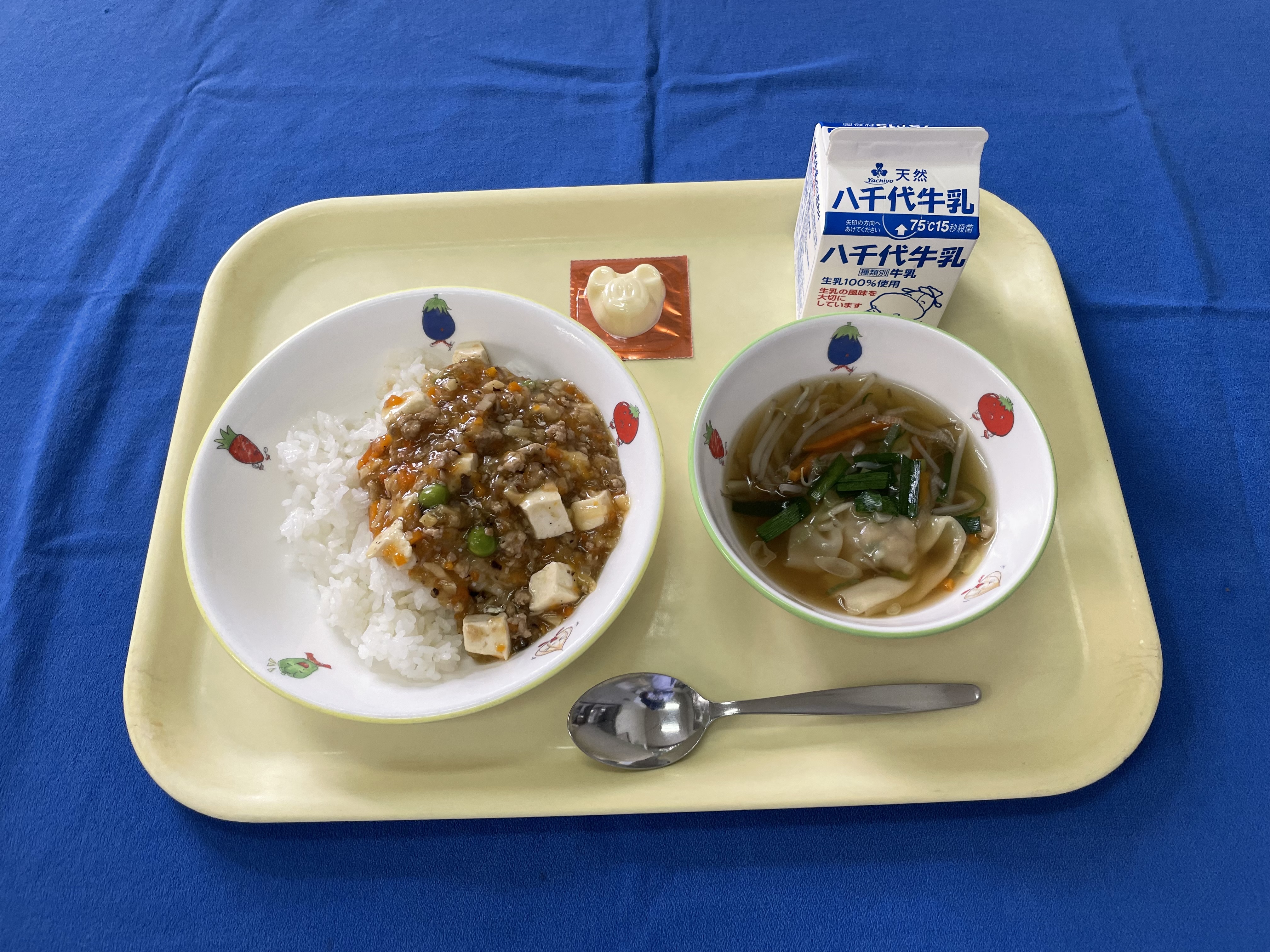 麦ごはん 五目豆腐 ワンタンスープ チーズ 牛乳 |