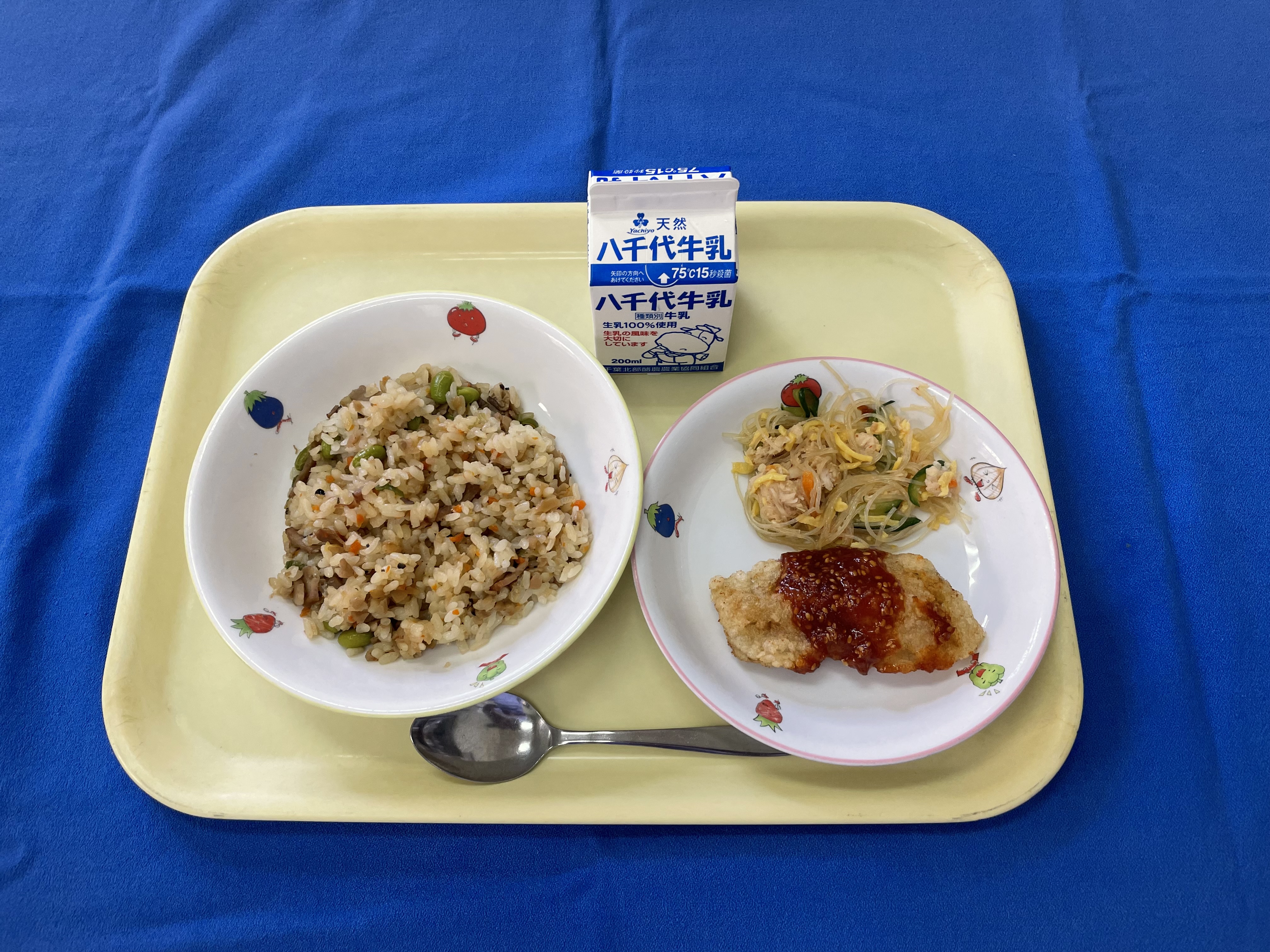ご飯 ヤンニョムチキン 春雨サラダ トマトと卵のスープ 牛乳 |