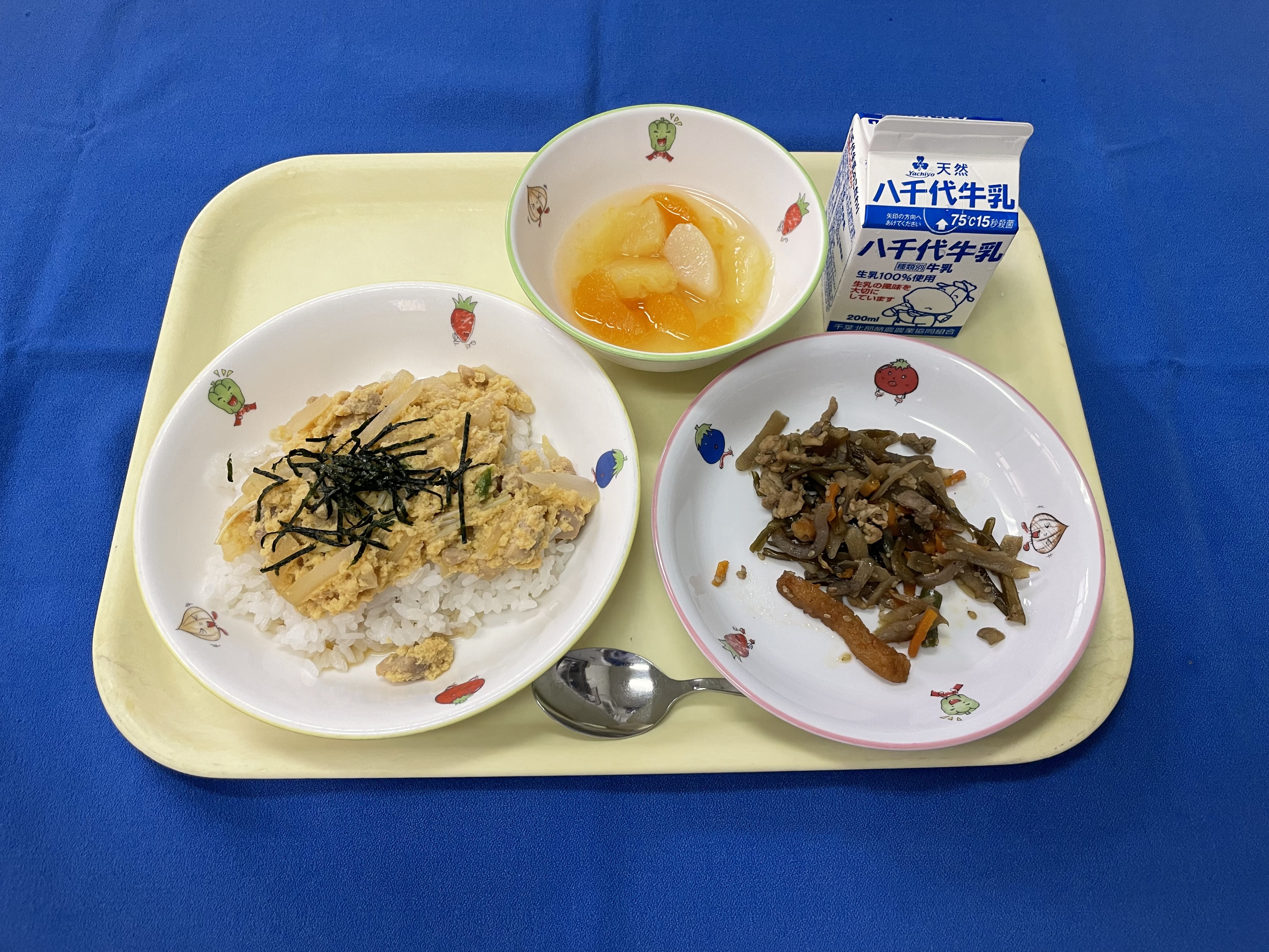 ご飯 親子丼 茎わかめのきんぴら フルーツパンチ 牛乳 |