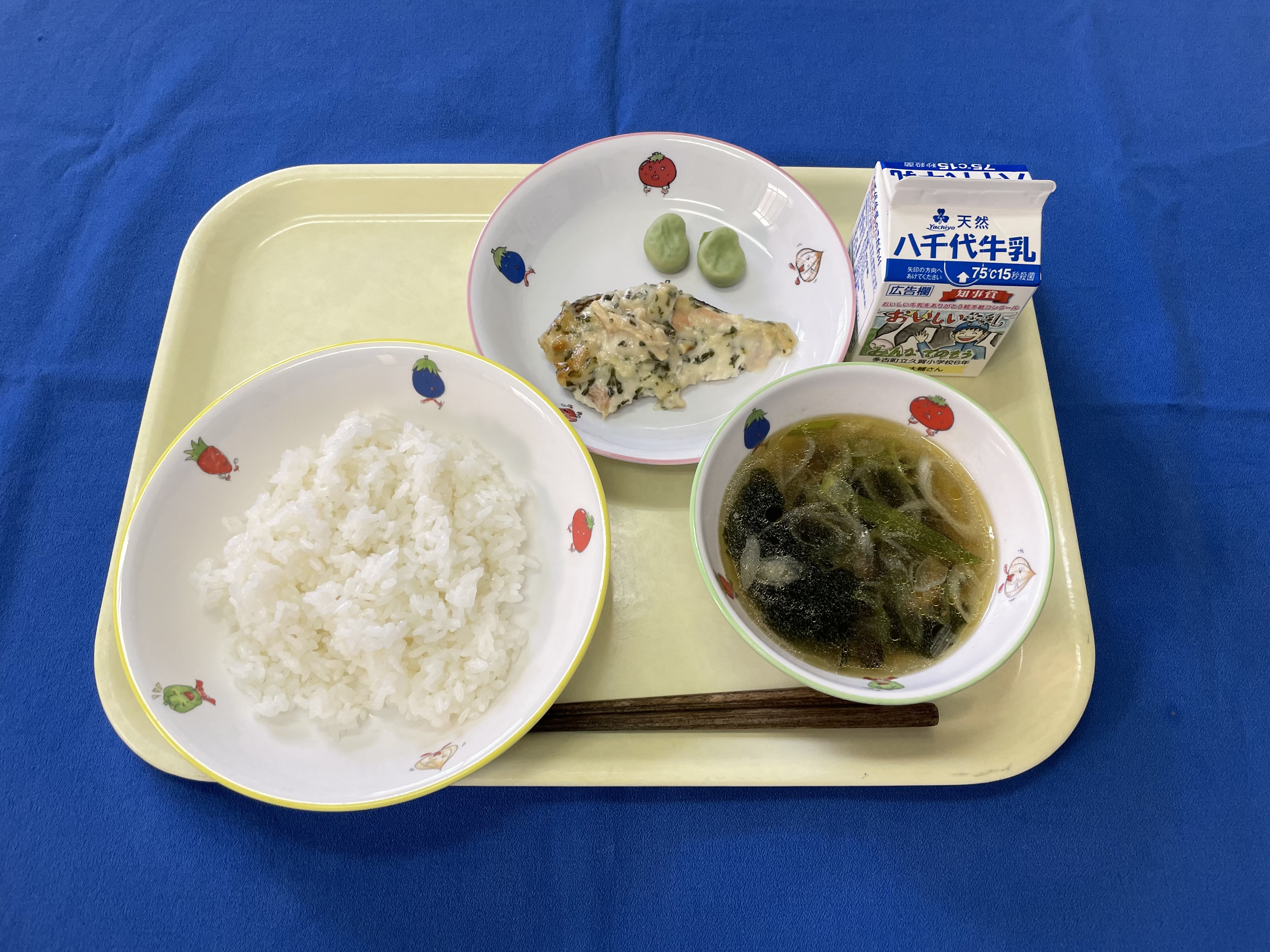 牛乳(千葉) 米(千葉) 鮭(北海道) そら豆(千葉/旭) パセリ(千葉/旭) 長ネギ(茨城/岩井) 鶏もも肉(千葉) |