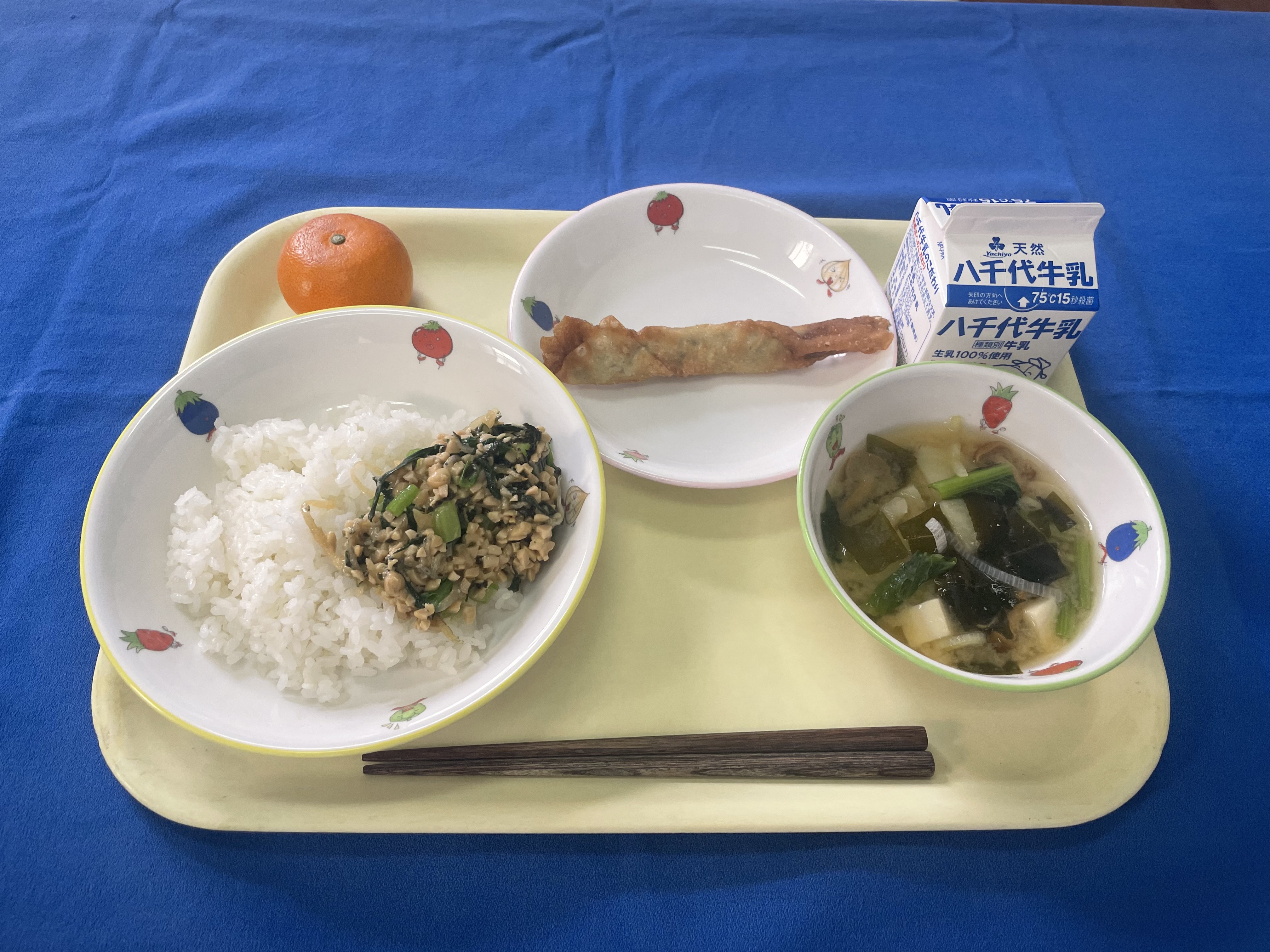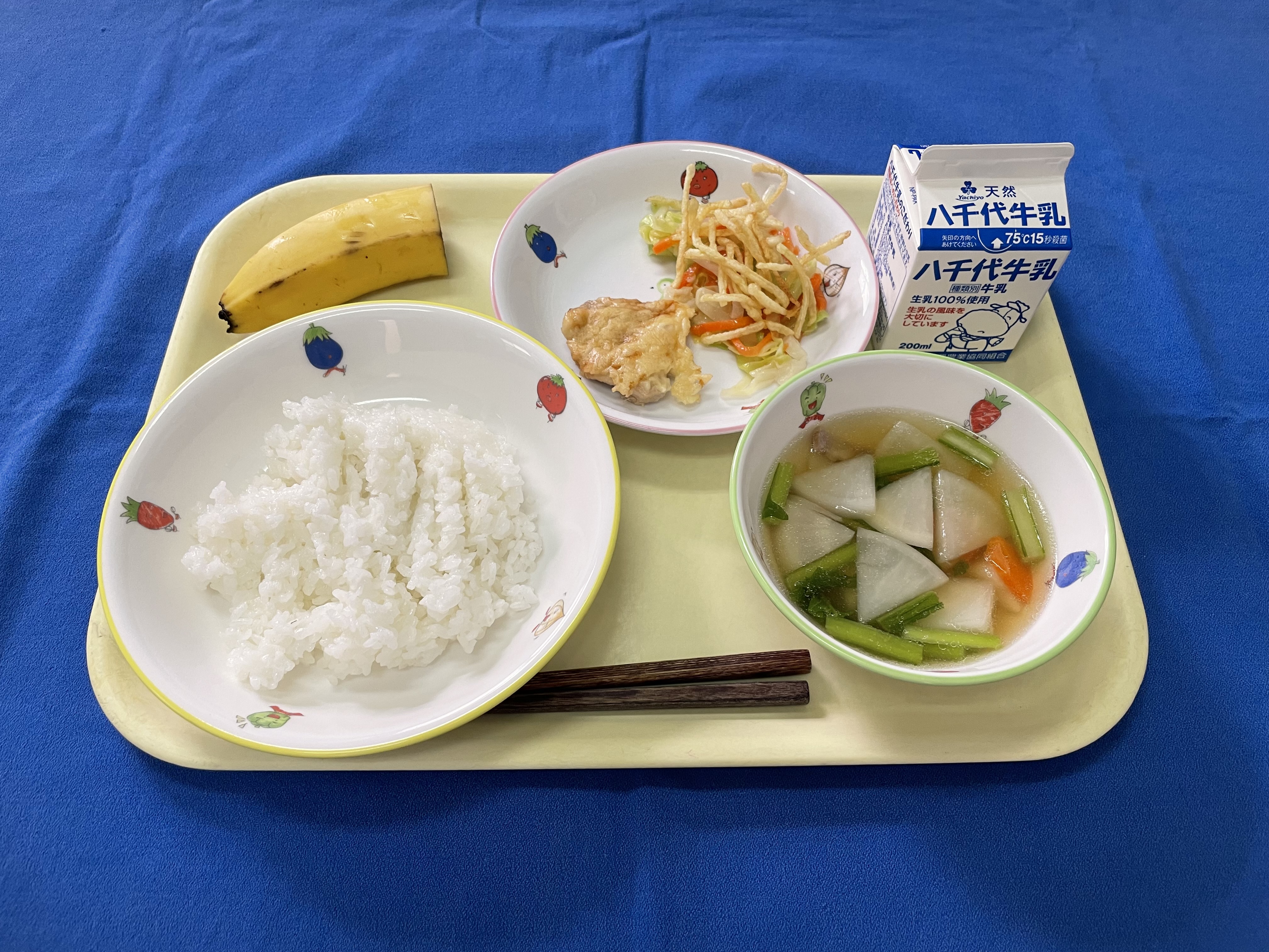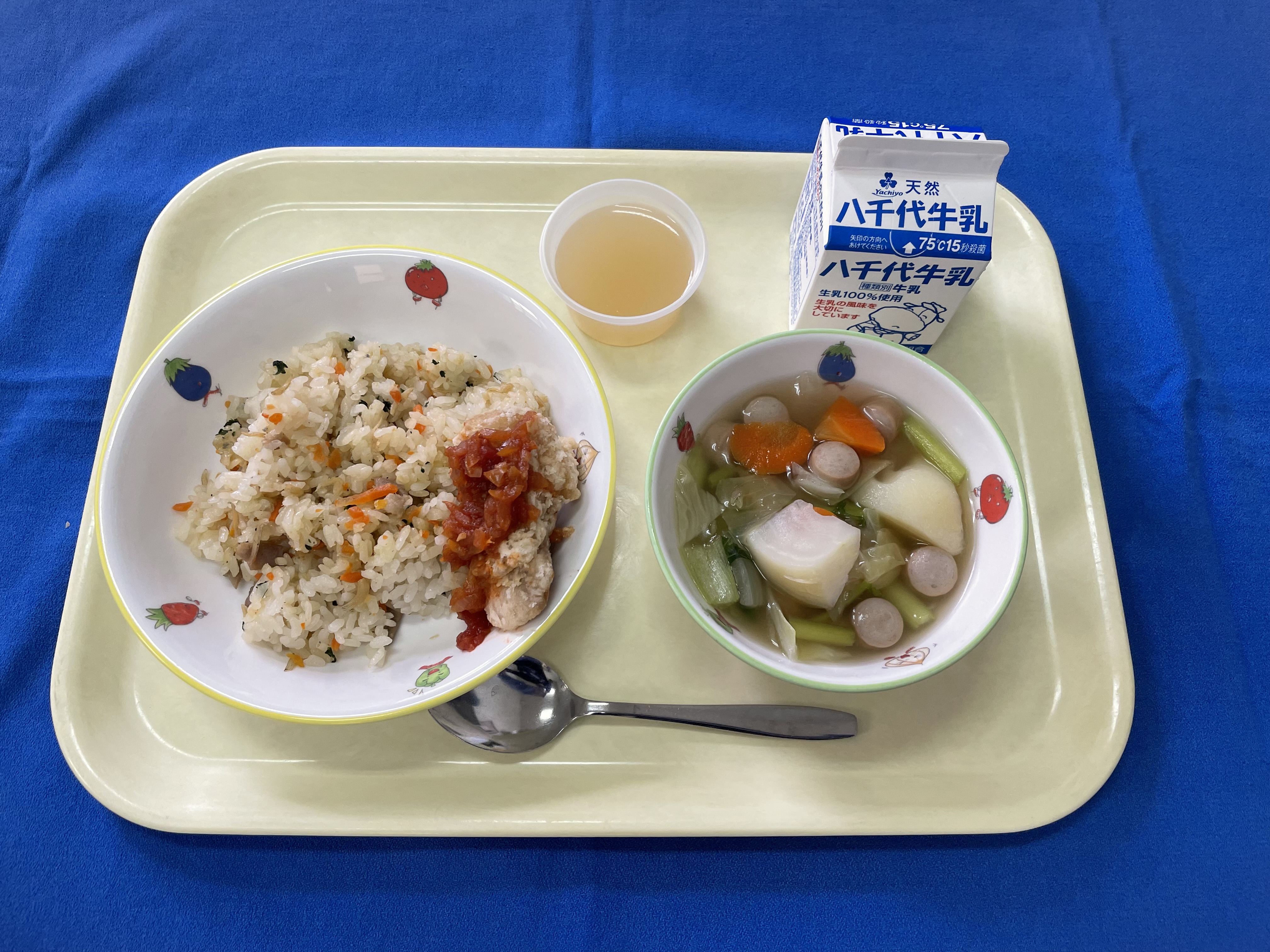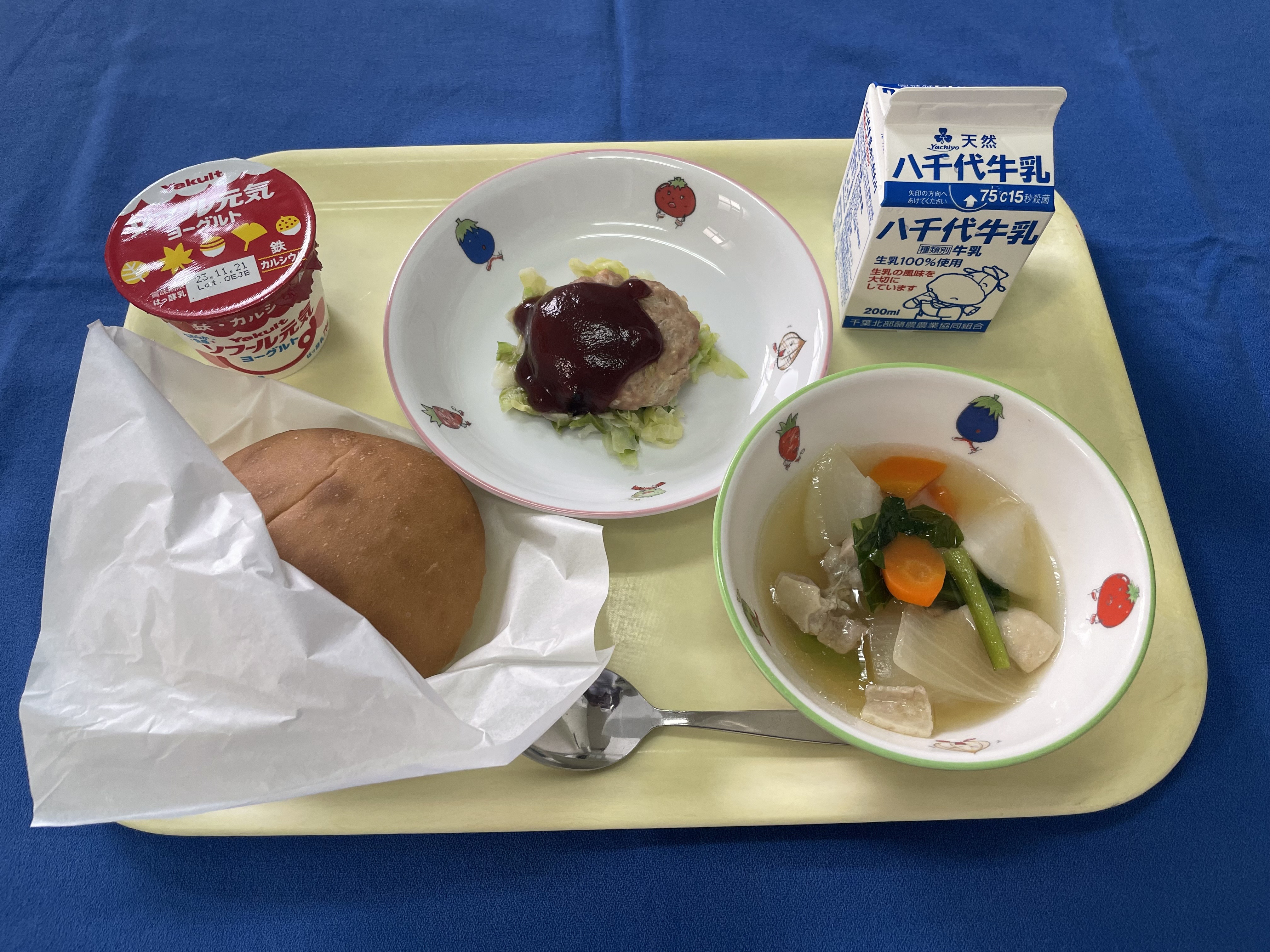 牛乳(千葉) 米(千葉) ごぼう(青森/十和田) 小松菜(埼玉/南彩) 大根(徳島/里浦) れんこん(茨城) 人参(千葉/山武) 鶏もも肉(青森) |