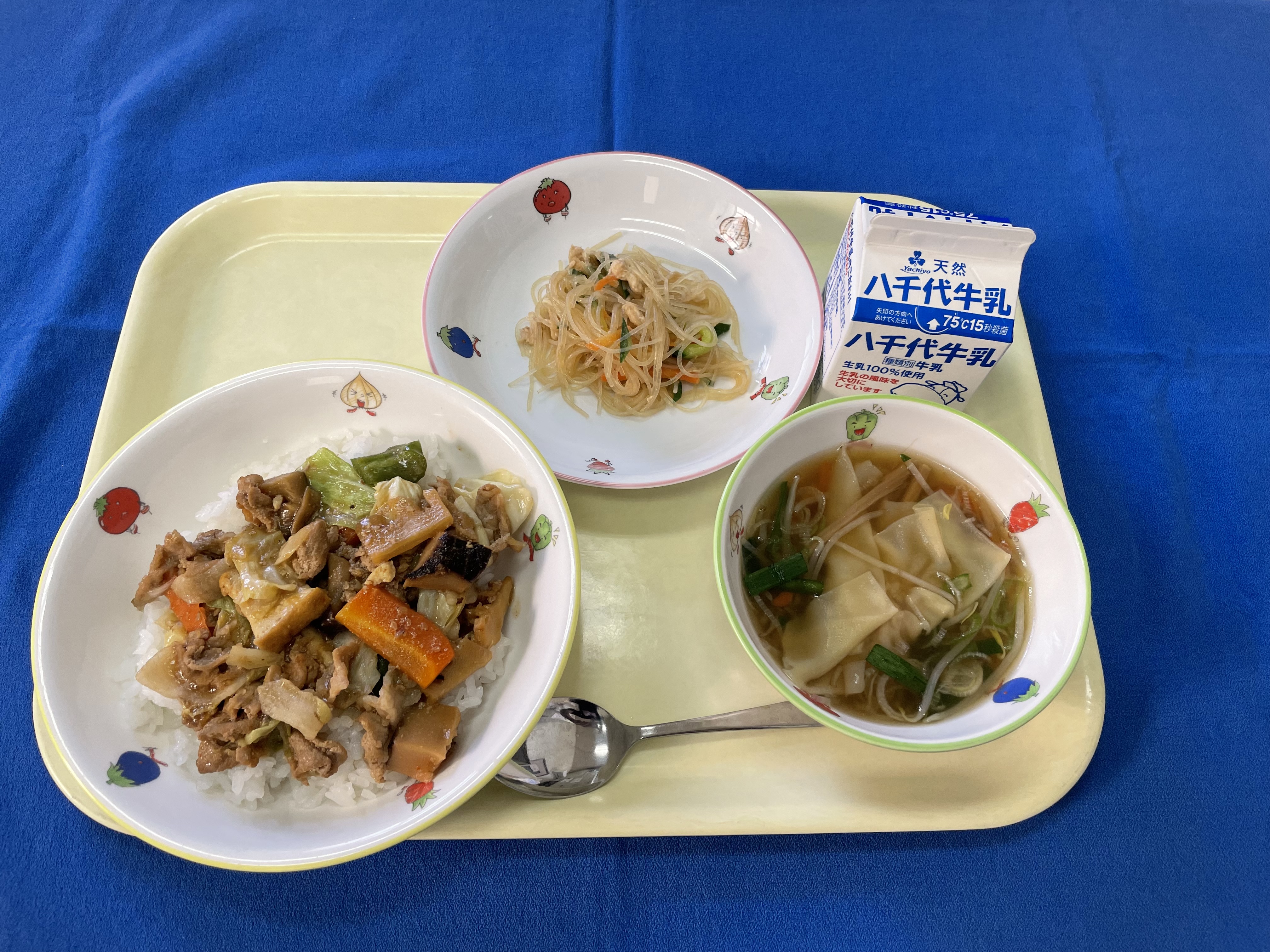 ご飯 ホイコ-ロ- 春雨サラダ ワンタンスープ 牛乳 |
