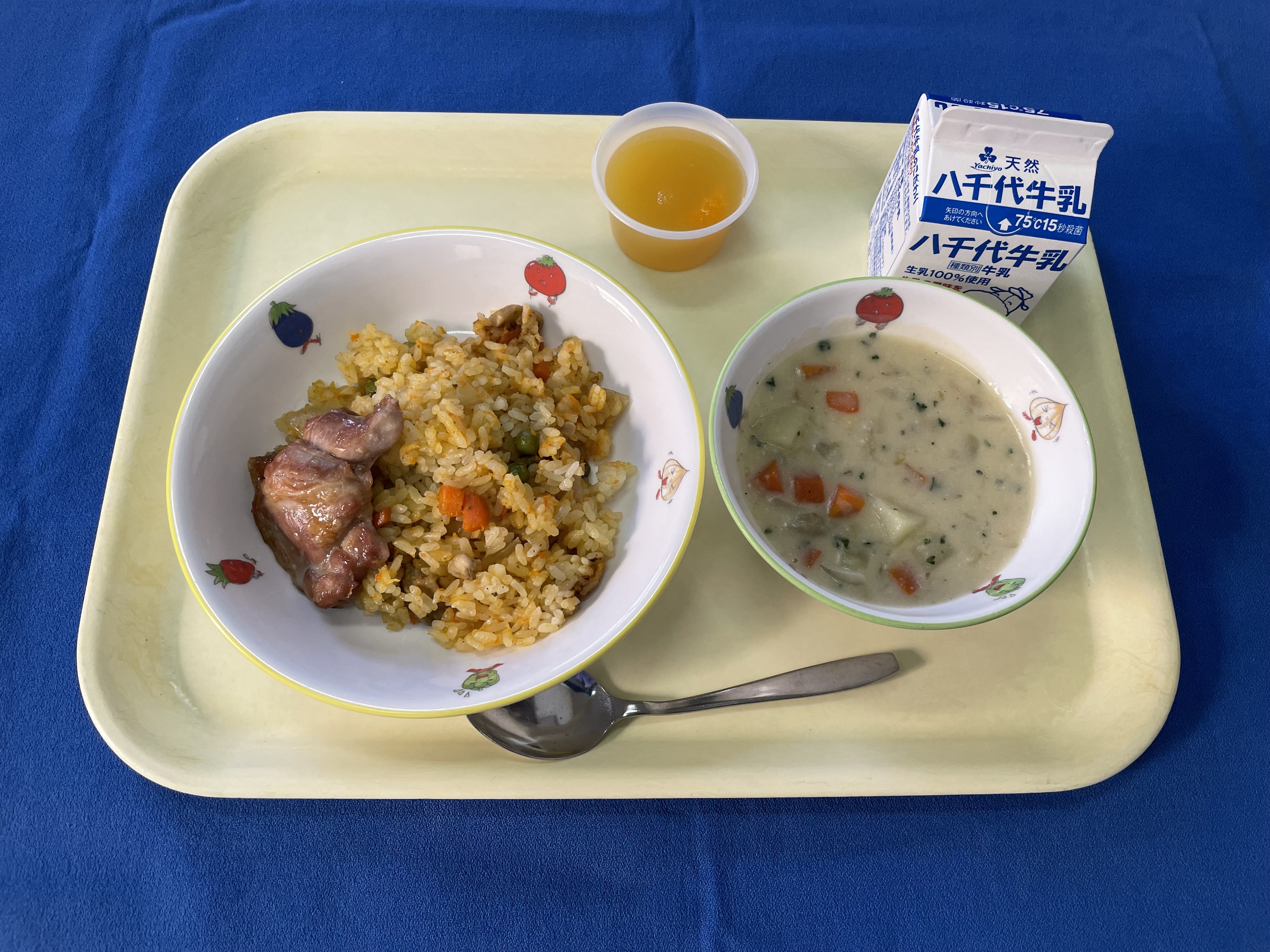 人参ピラフ 鶏肉の照り焼き クラムチャウダー オレンジゼリー 牛乳 |