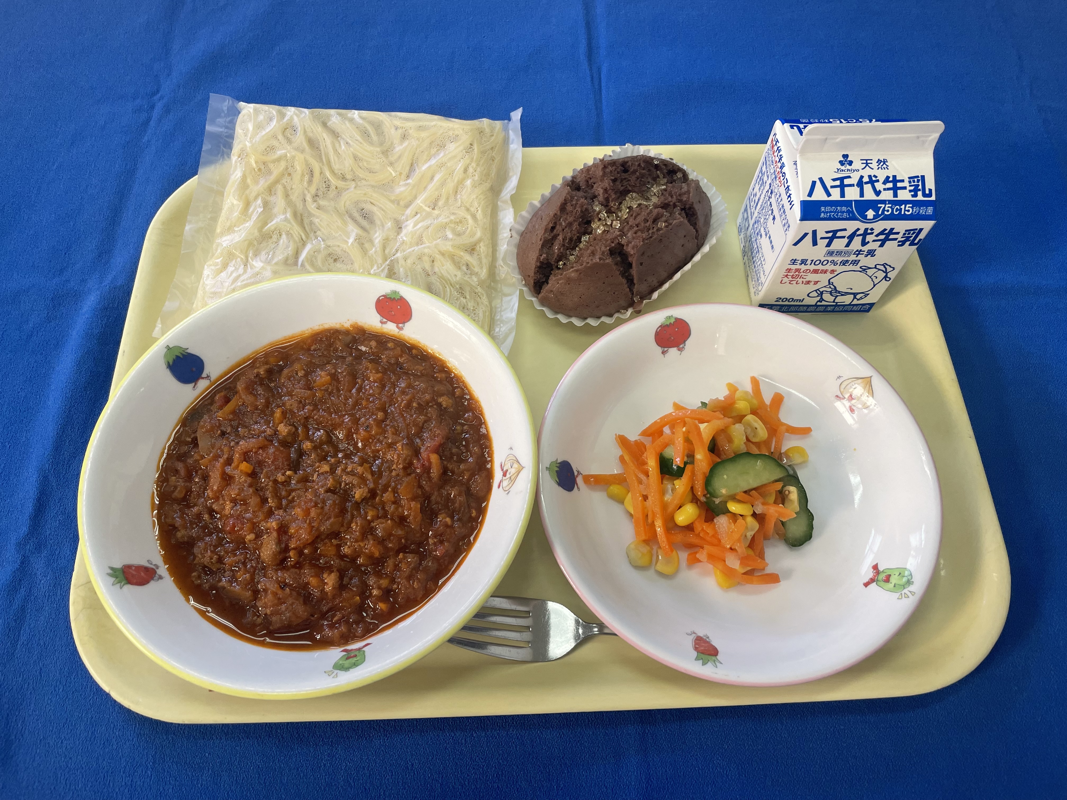 【おはなし給食】 スパゲッティ ミートソース にんじんサラダ 蒸しパン氷砂糖かけ 牛乳 今日は、「チリとチリリ」という絵本に出てくる「蒸しパン氷砂糖かけ」が給食に出ます。 絵本には様々な味の蒸しパンが登場しますが、今日はそのうちの「ココア蒸しパン」です。 |