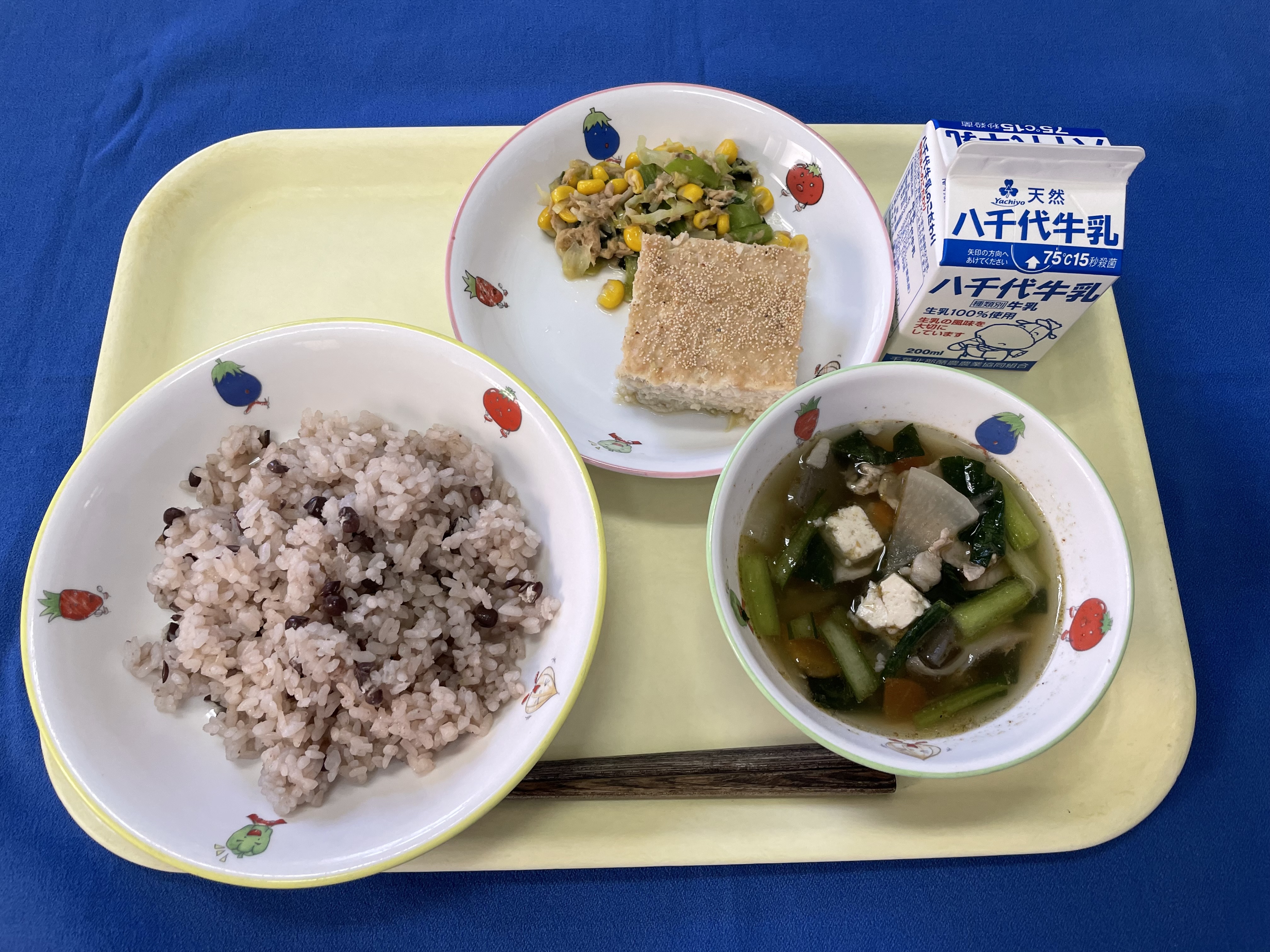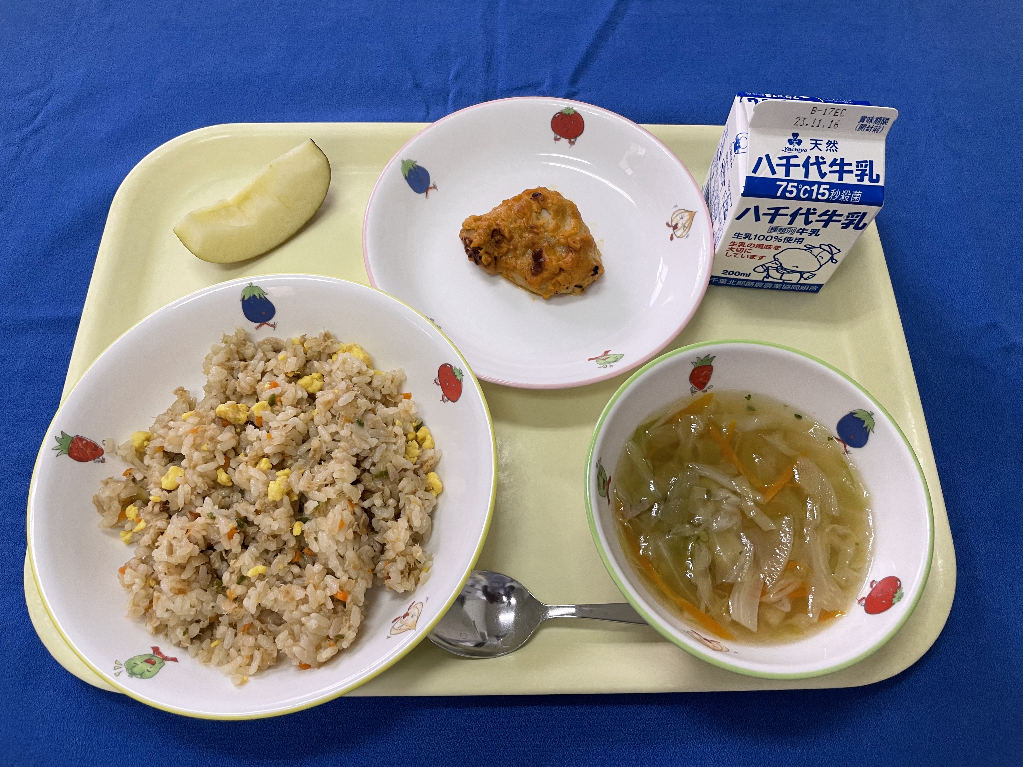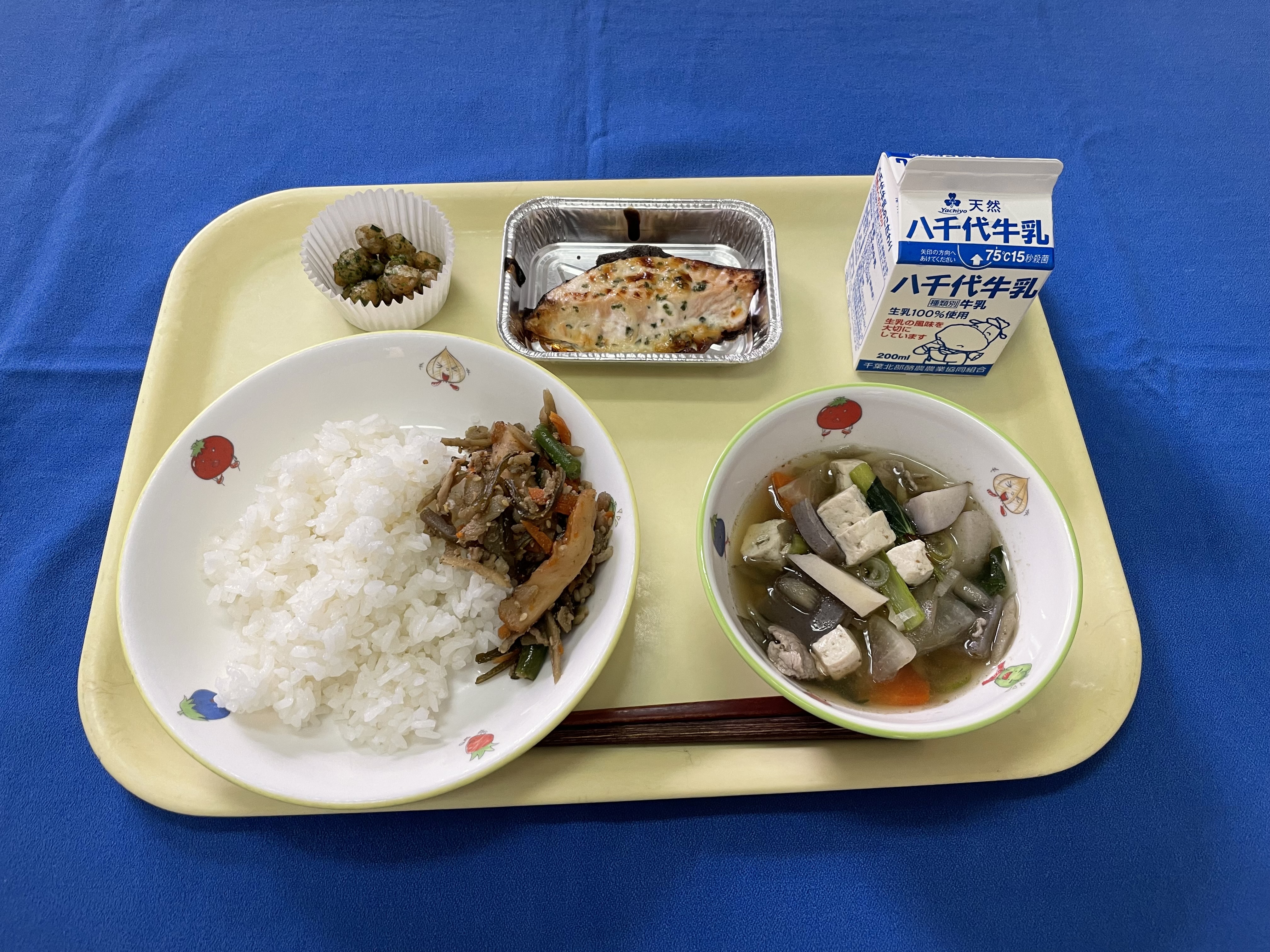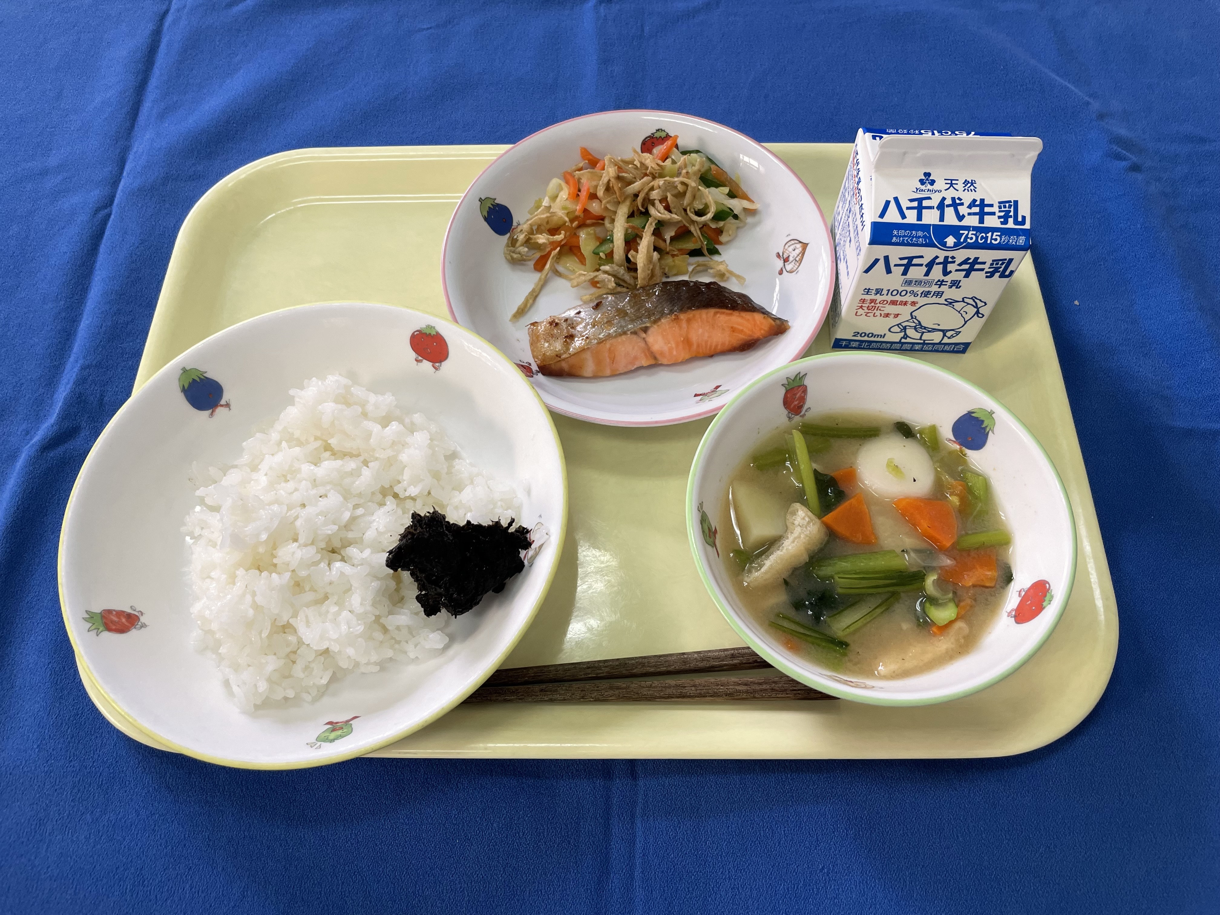 牛乳(千葉) 米(千葉) さけ(宮城) ごぼう(青森/十和田) きゅうり(埼玉) 小松菜(埼玉/南彩) キャベツ(愛知/豊橋) 人参(千葉/山武) |
