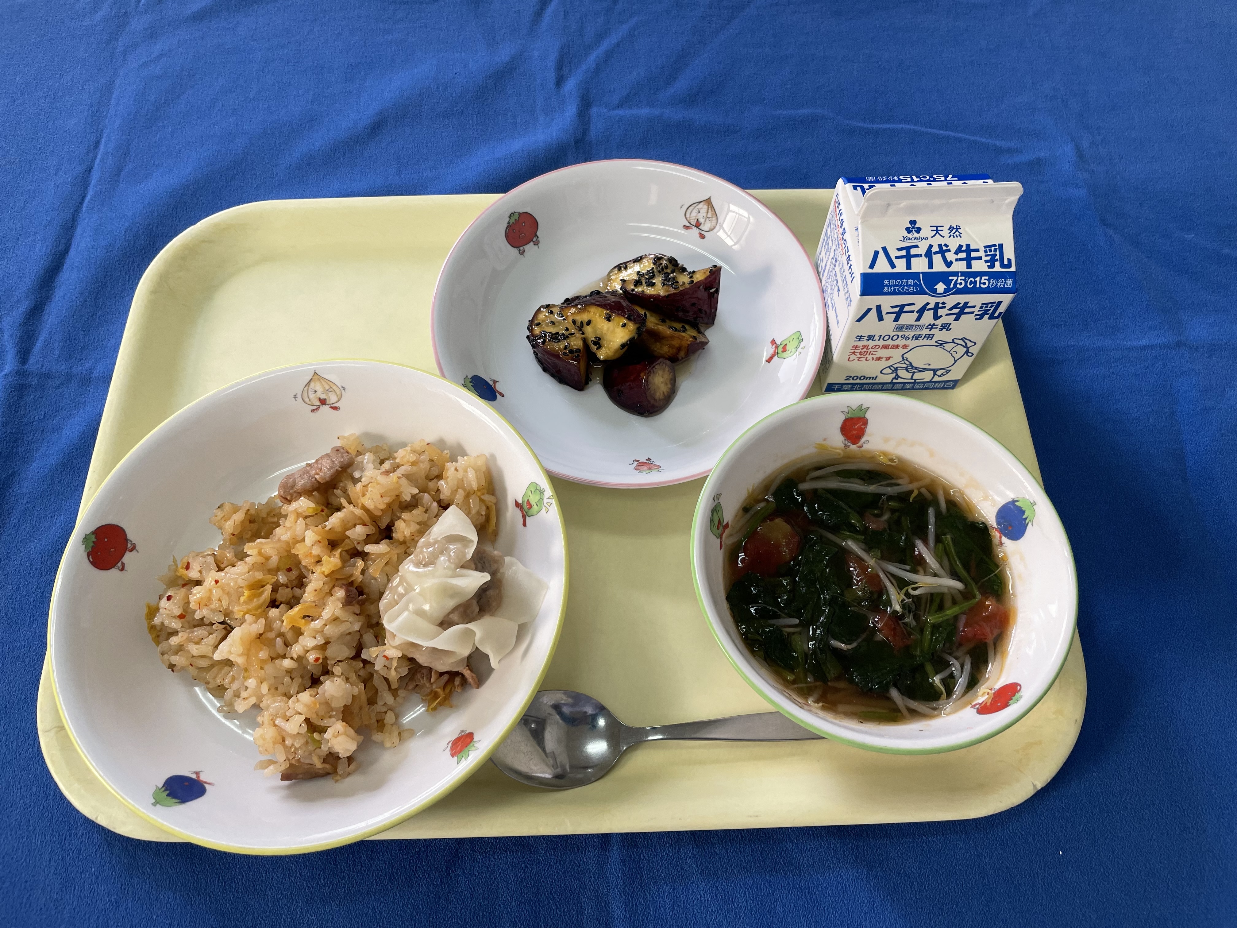 キムタクご飯 手作りしゅうまい トマトとほうれん草のスープ 大学芋 牛乳 |