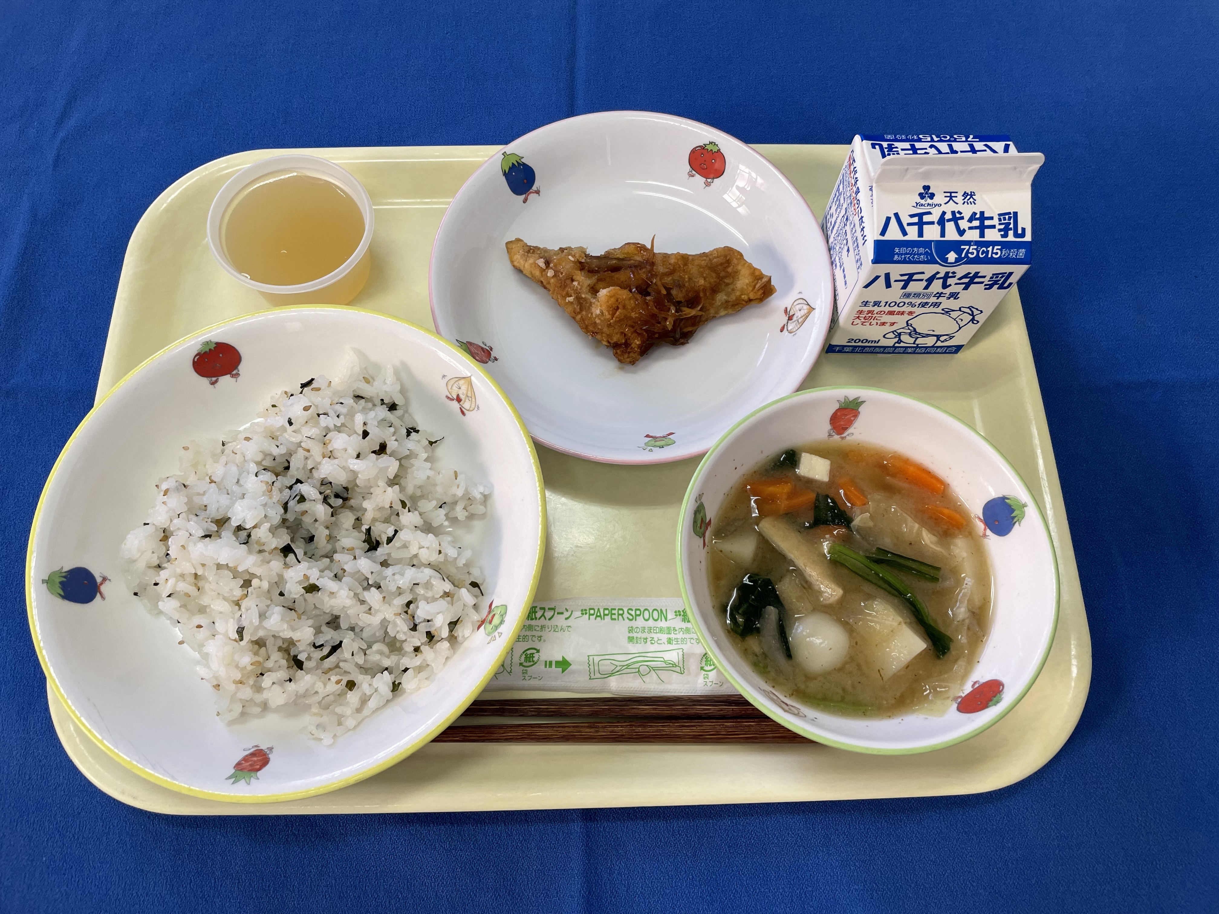 わかめごはん たらの中華揚げ 八宝味噌汁 ピーチゼリー 牛乳 ※都合により、魚の種類が変更になりました |