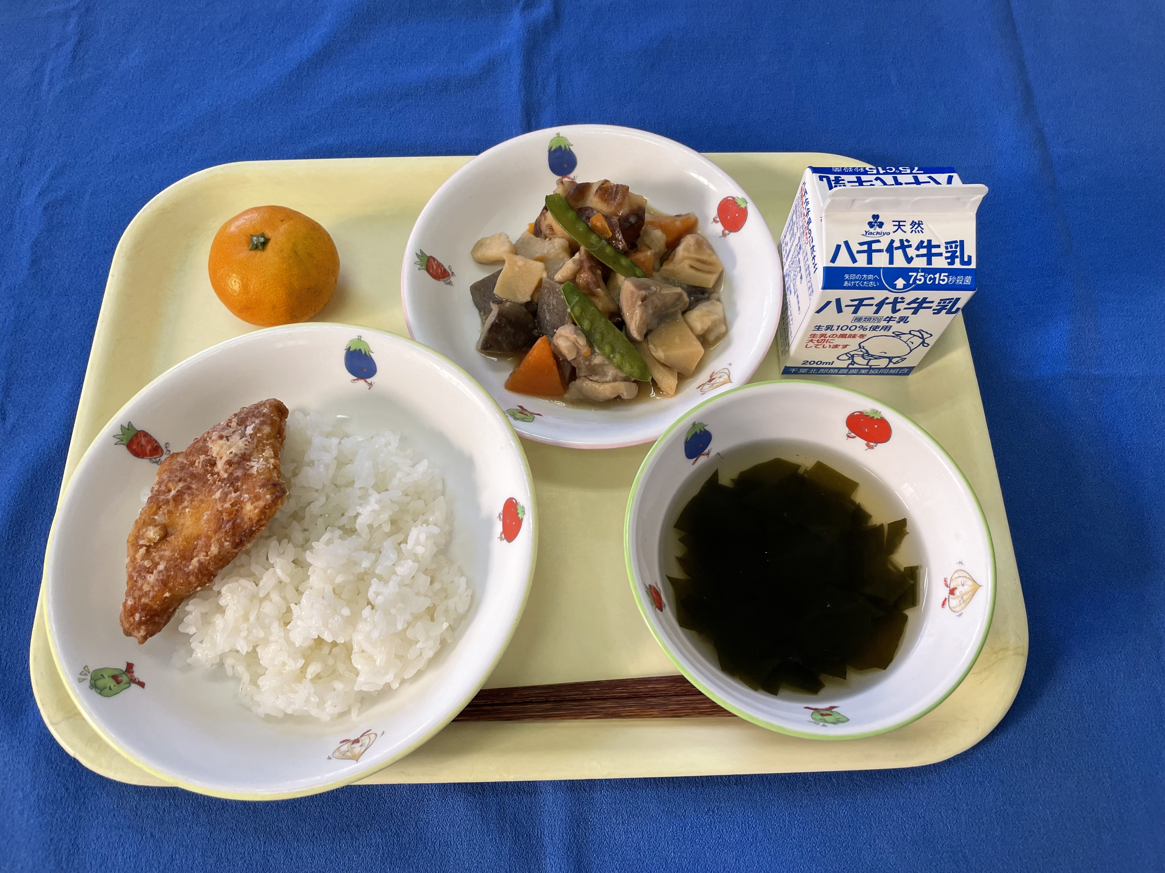 ご飯 カレイの竜田揚げ 筑前煮 すまし汁 みかん 牛乳 |