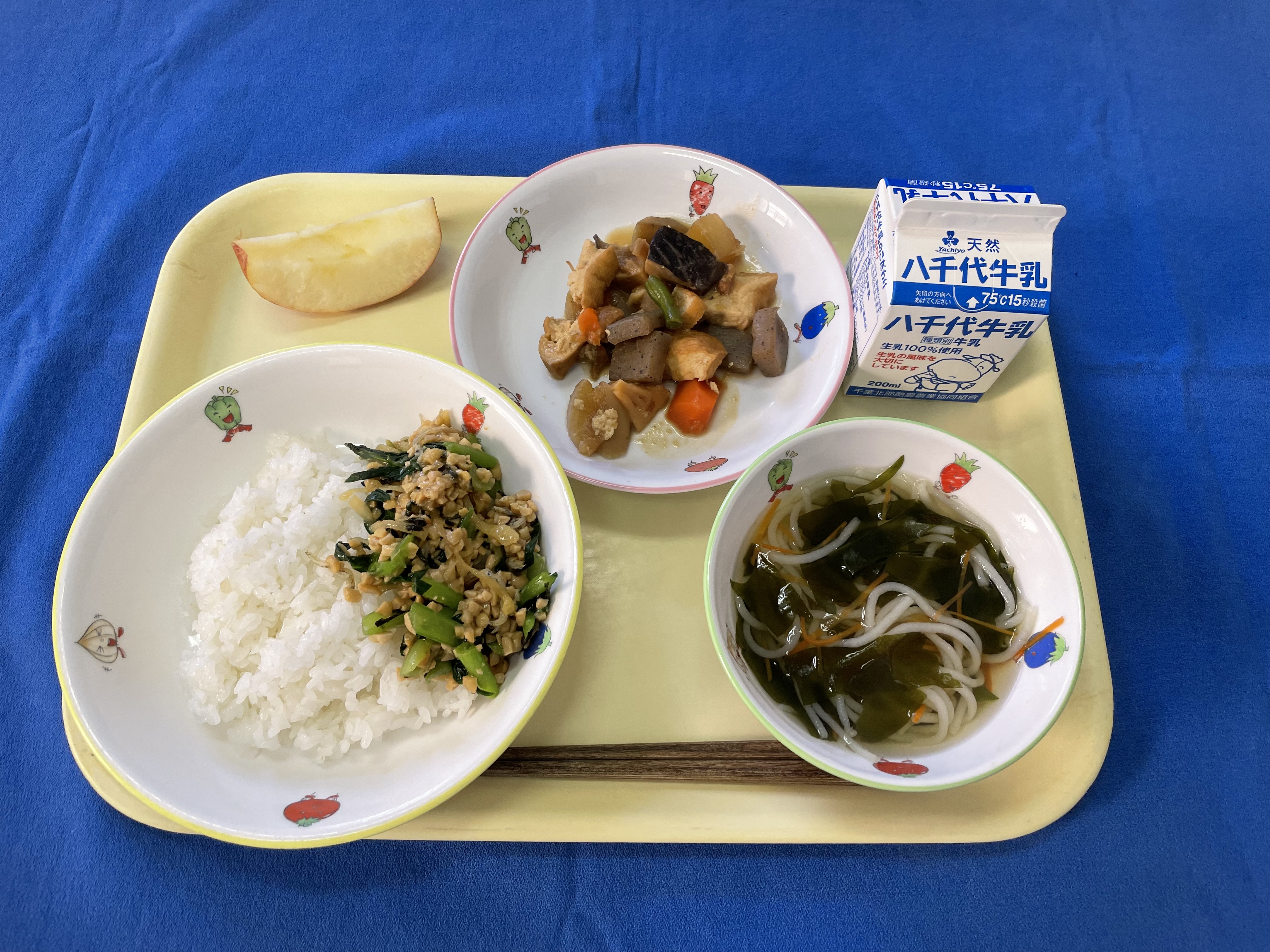 ご飯 納豆和え 鶏肉と根菜の味噌煮 すまし汁 りんご 牛乳 |