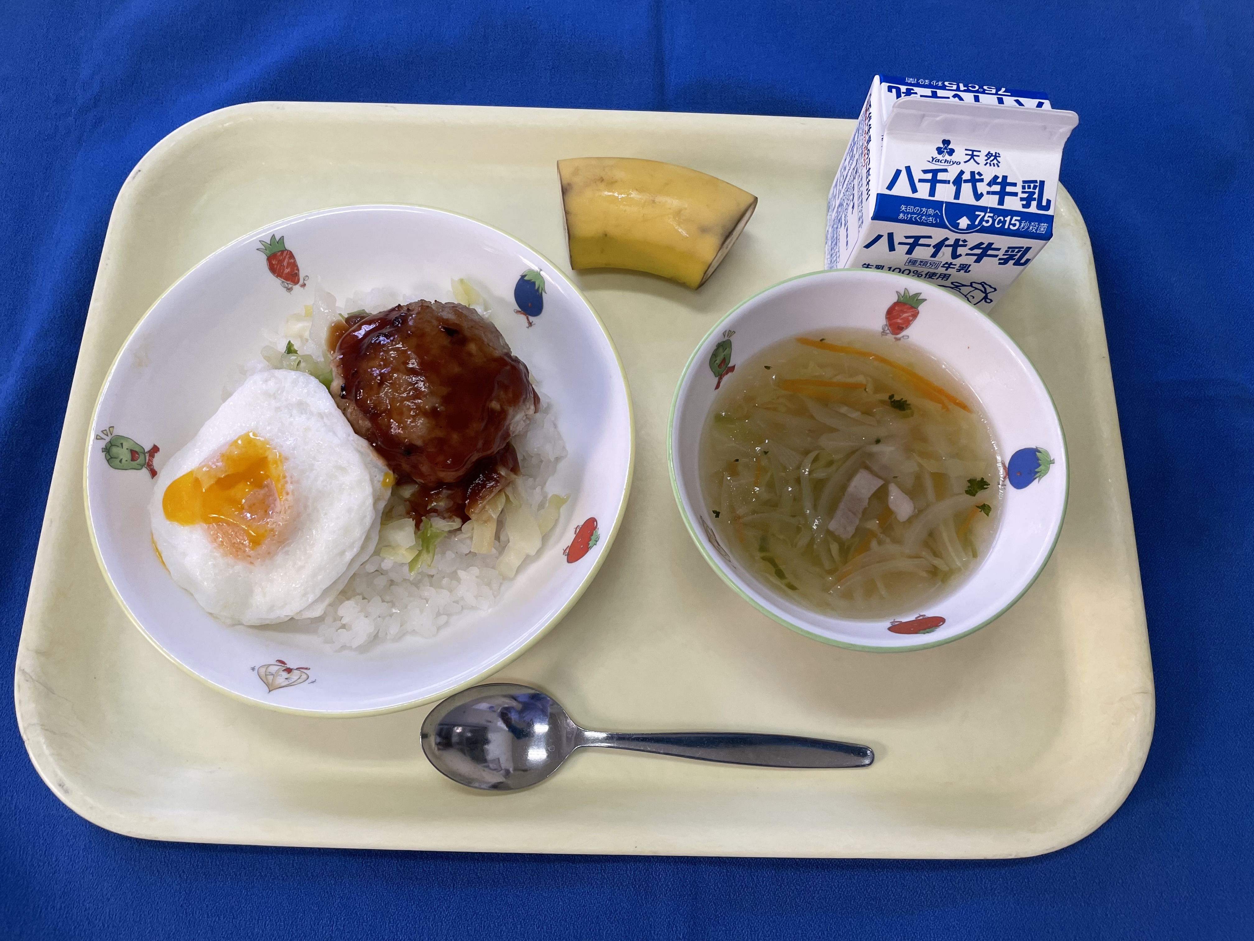 ご飯 ロコモコ丼 野菜スープ バナナ 牛乳 |
