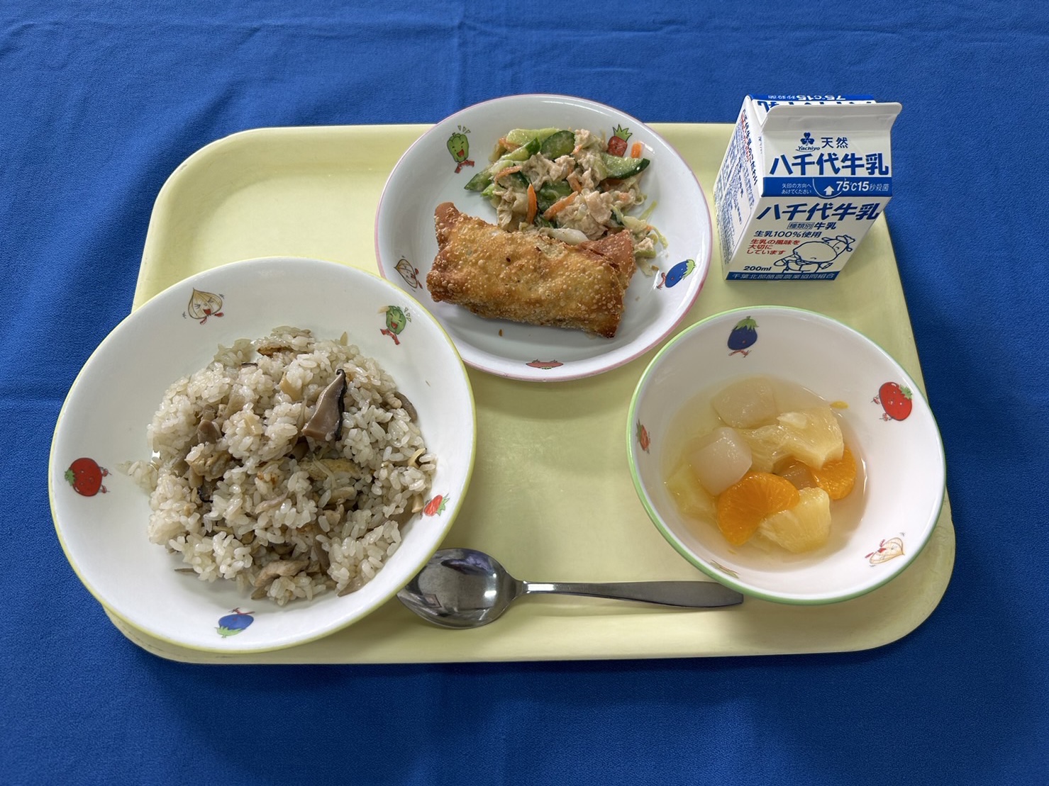 鶏ごぼうご飯 ポテトひじき春巻き 棒棒鶏 フルーツポンチ 牛乳 |
