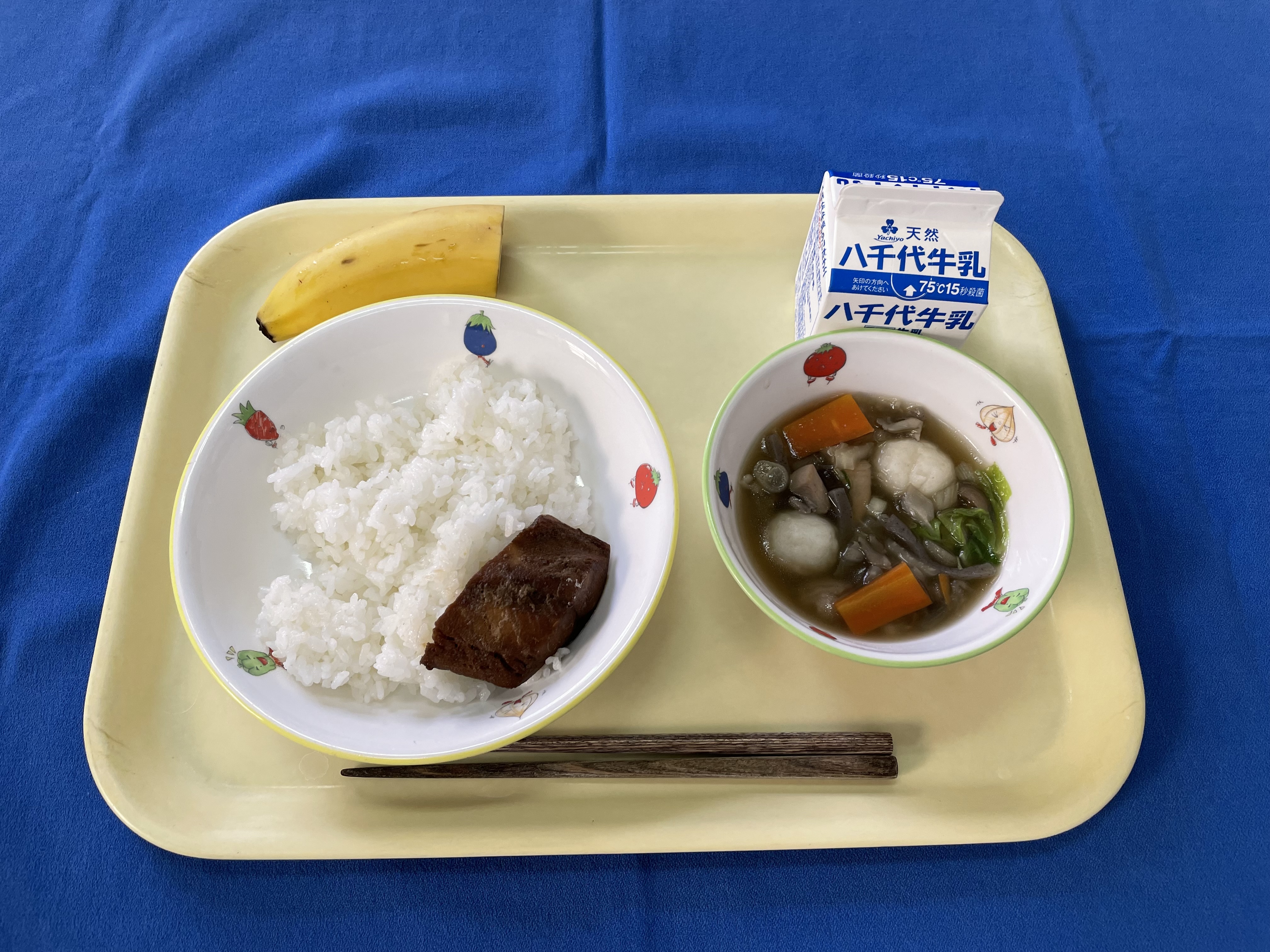 ご飯 鯖の甘露煮 だまこ汁 バナナ 牛乳 |
