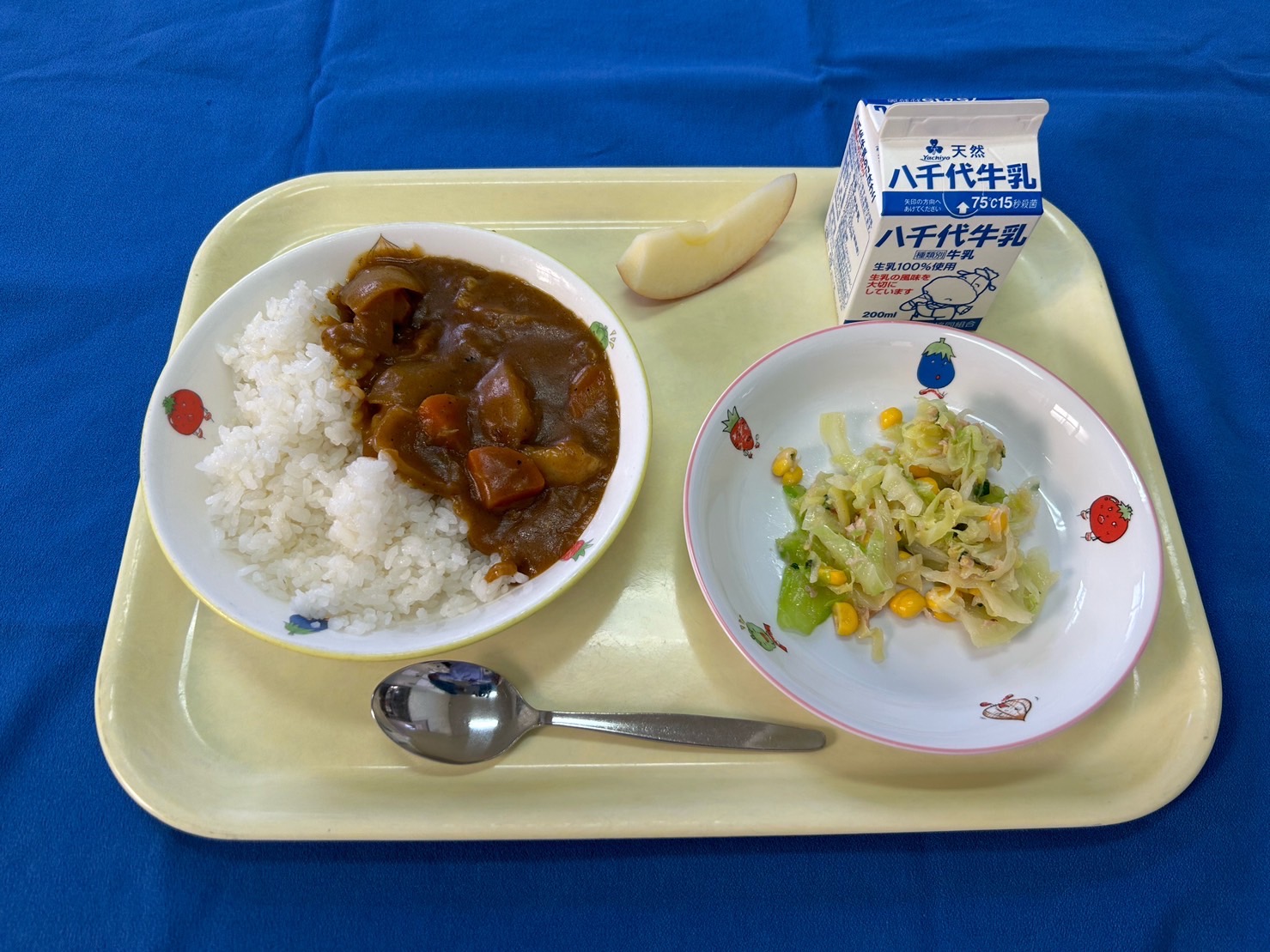 【給食開始日】 麦ごはん ポークカレー コールスローサラダ りんご 牛乳 |