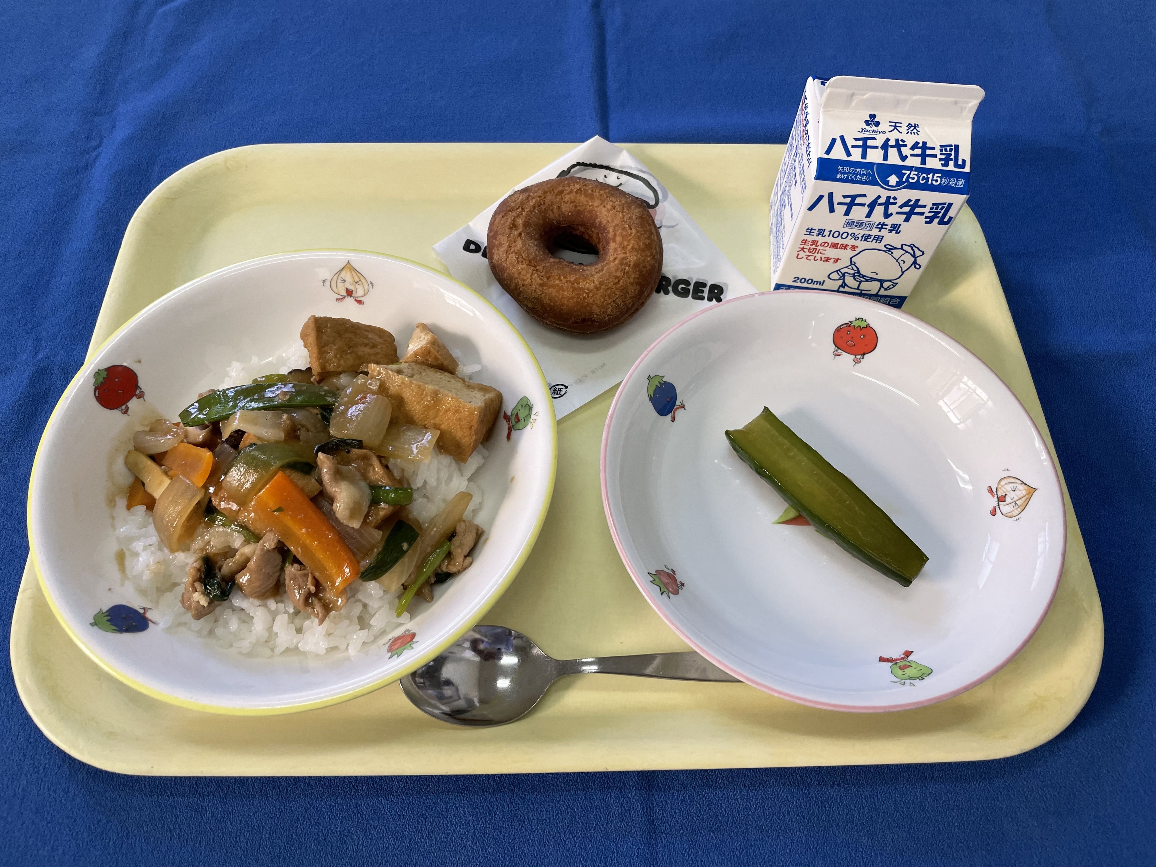 【おはなし給食】 ご飯 家常豆腐 きゅうりの中華漬け バムとケロのドーナツ 牛乳 今日は、「バムとケロのにちようび」に登場する「ドーナツ」が給食に出ます。 |