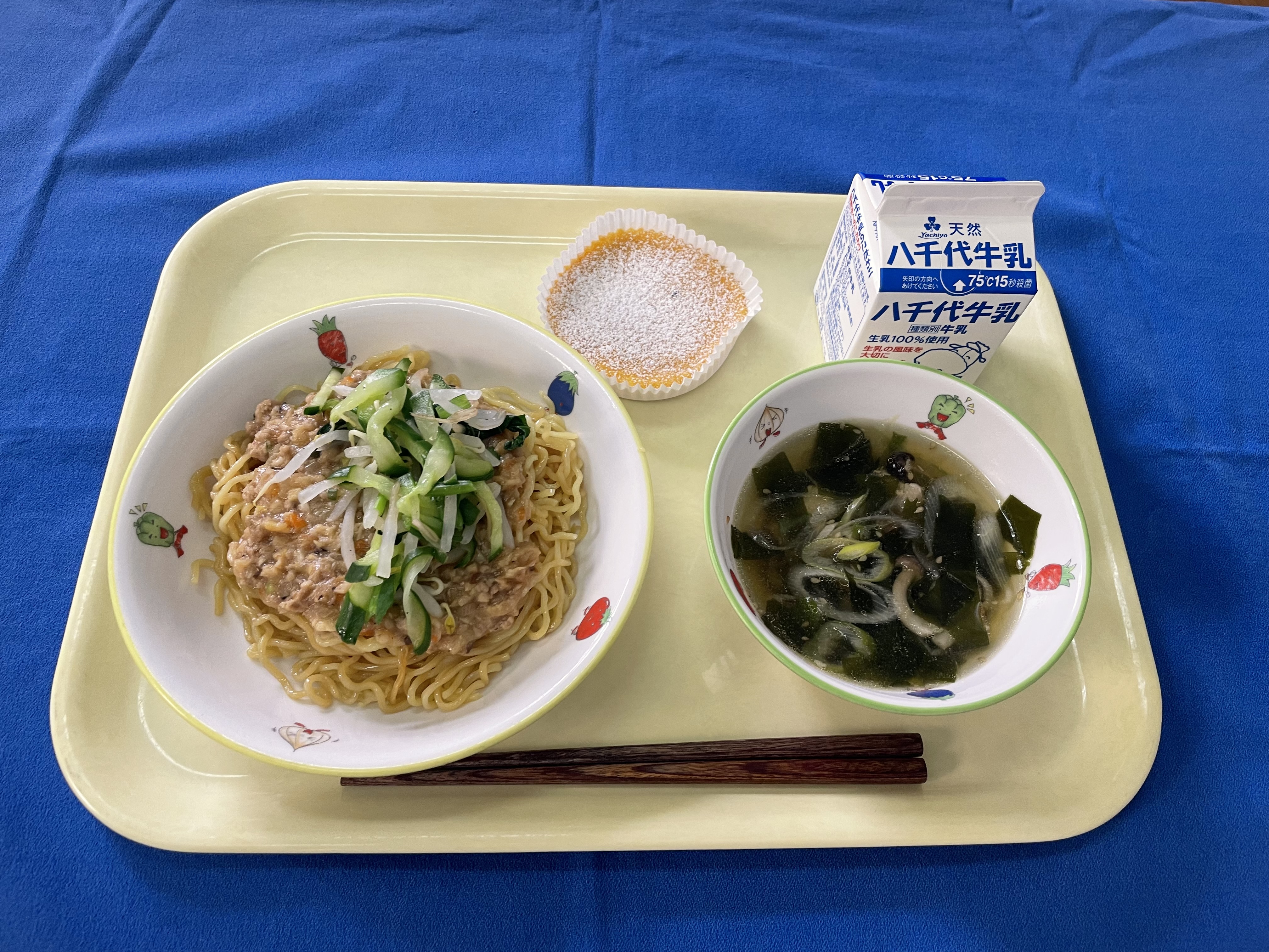 【冬至献立】 ジャージャー麺 わかめスープ かぼちゃのチーズケーキ 牛乳 |