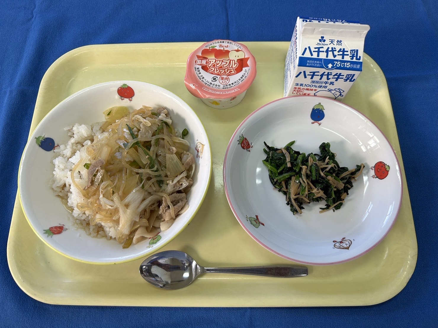 麦ごはん 豚丼 ほうれん草の磯和え アップルフレッシュゼリー 牛乳 |