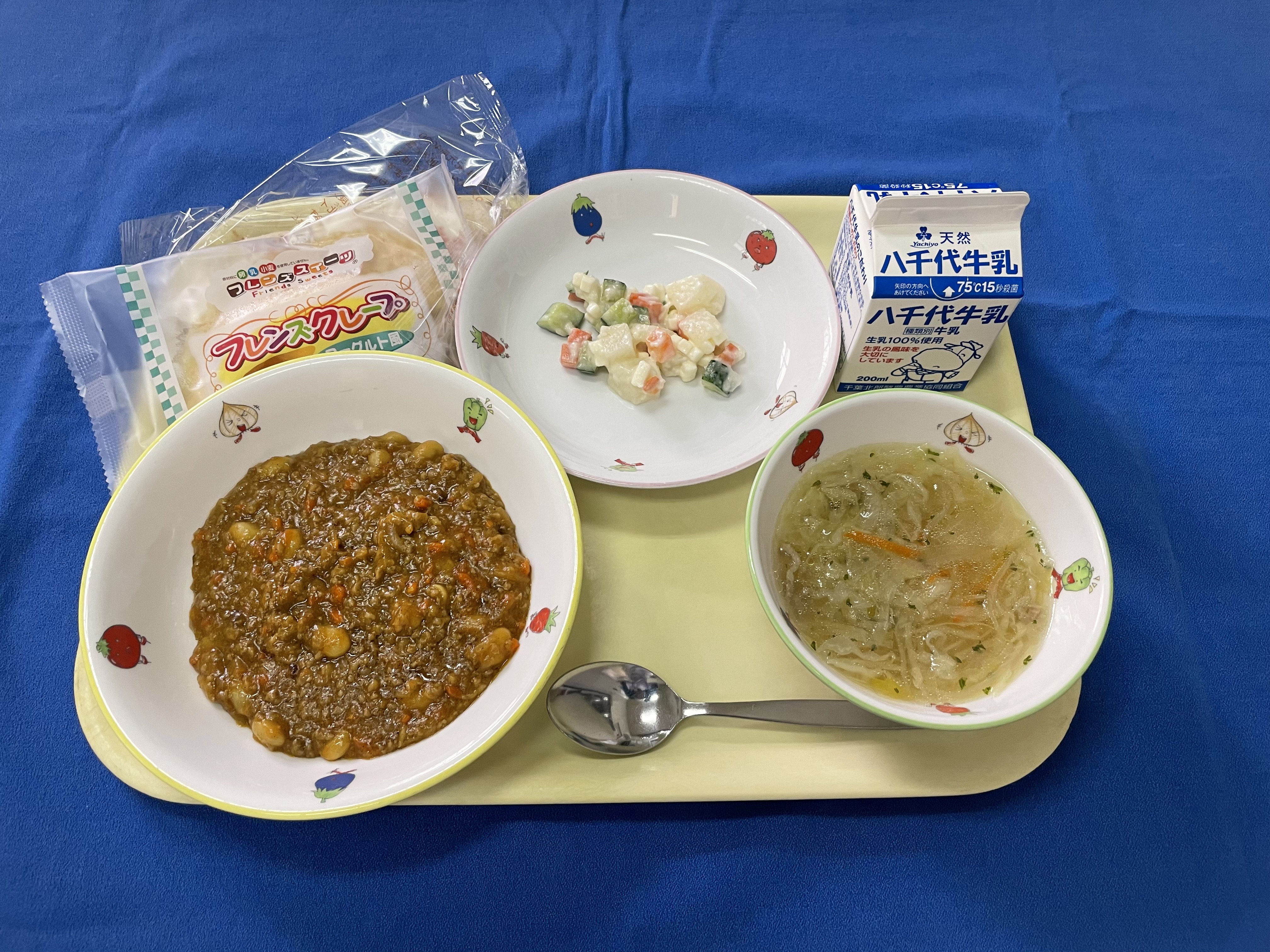 ナン カレー マセドアンサラダ 野菜スープ クレープ 牛乳 |