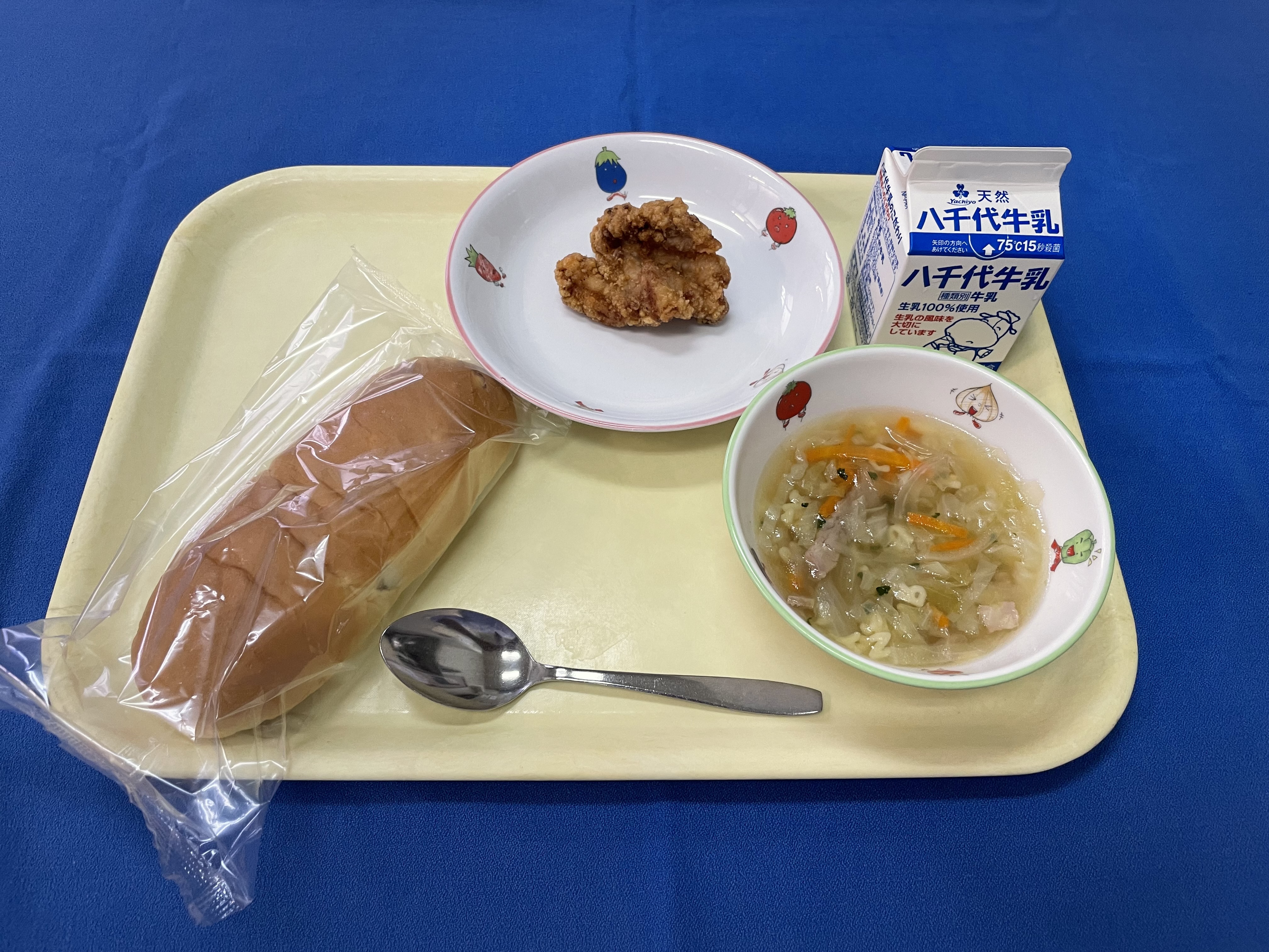 さつまいもパン 鶏のから揚げ ABCスープ 牛乳 |