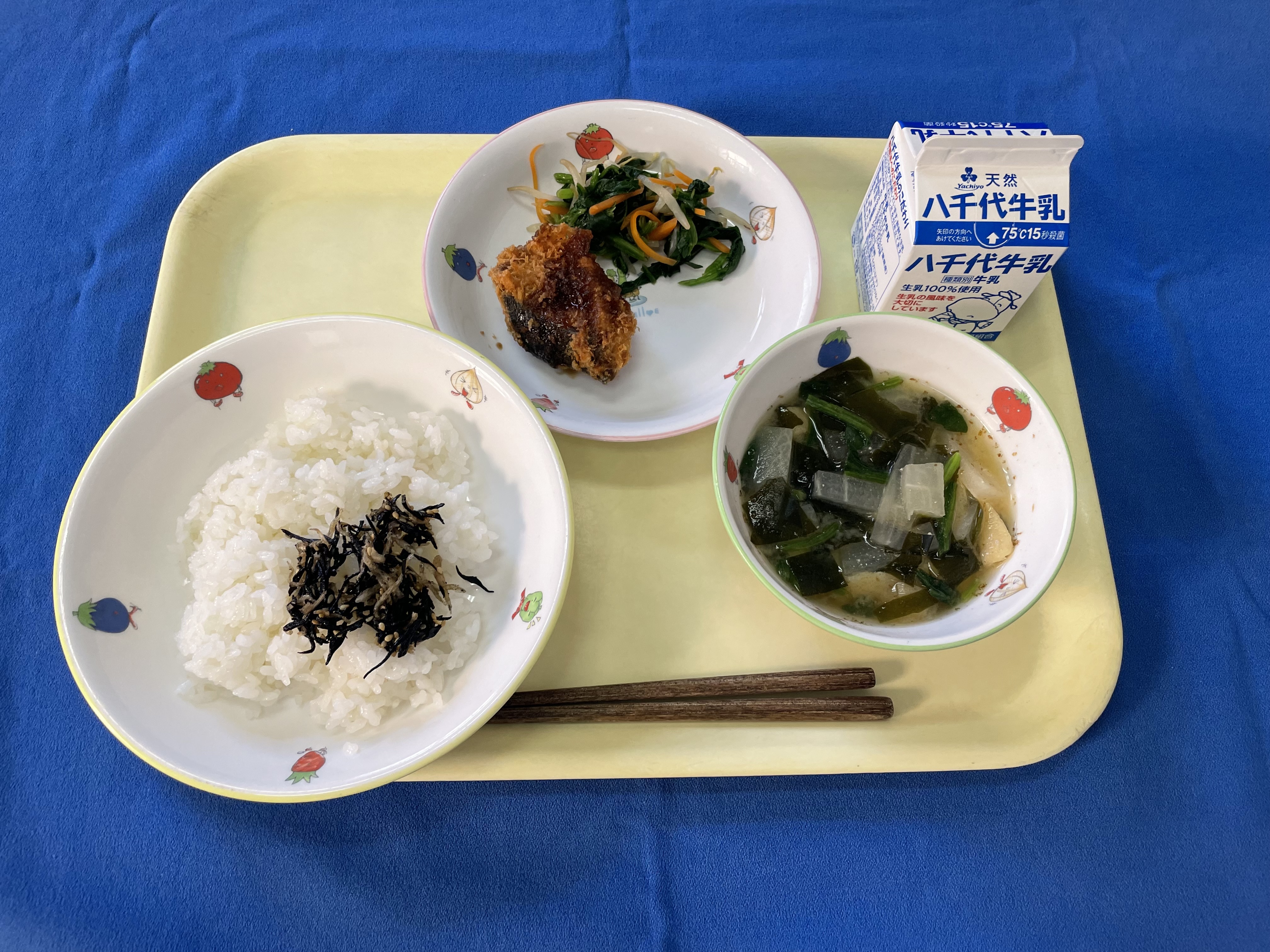 ご飯 ひじきふりかけ ぶりカツ からしあえ 味噌汁 牛乳 |