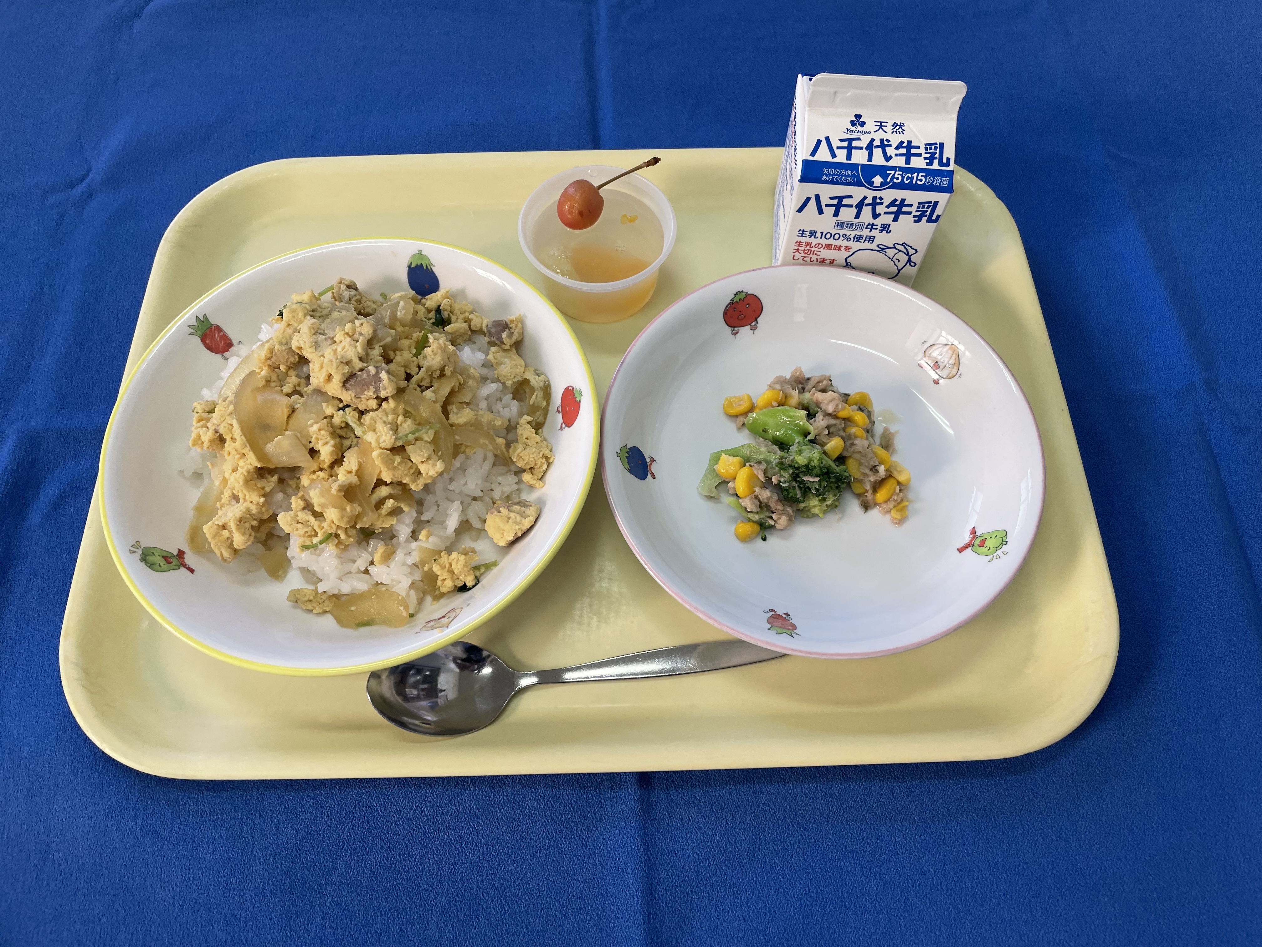 【おはなし給食】 ご飯 あぶたま丼 ブロッコリーとツナのサラダ フルーツゼリー 牛乳 今日は、「おばけのきゅうしょく」という本に出てくる「フルーツゼリー」が給食に出ます。 |