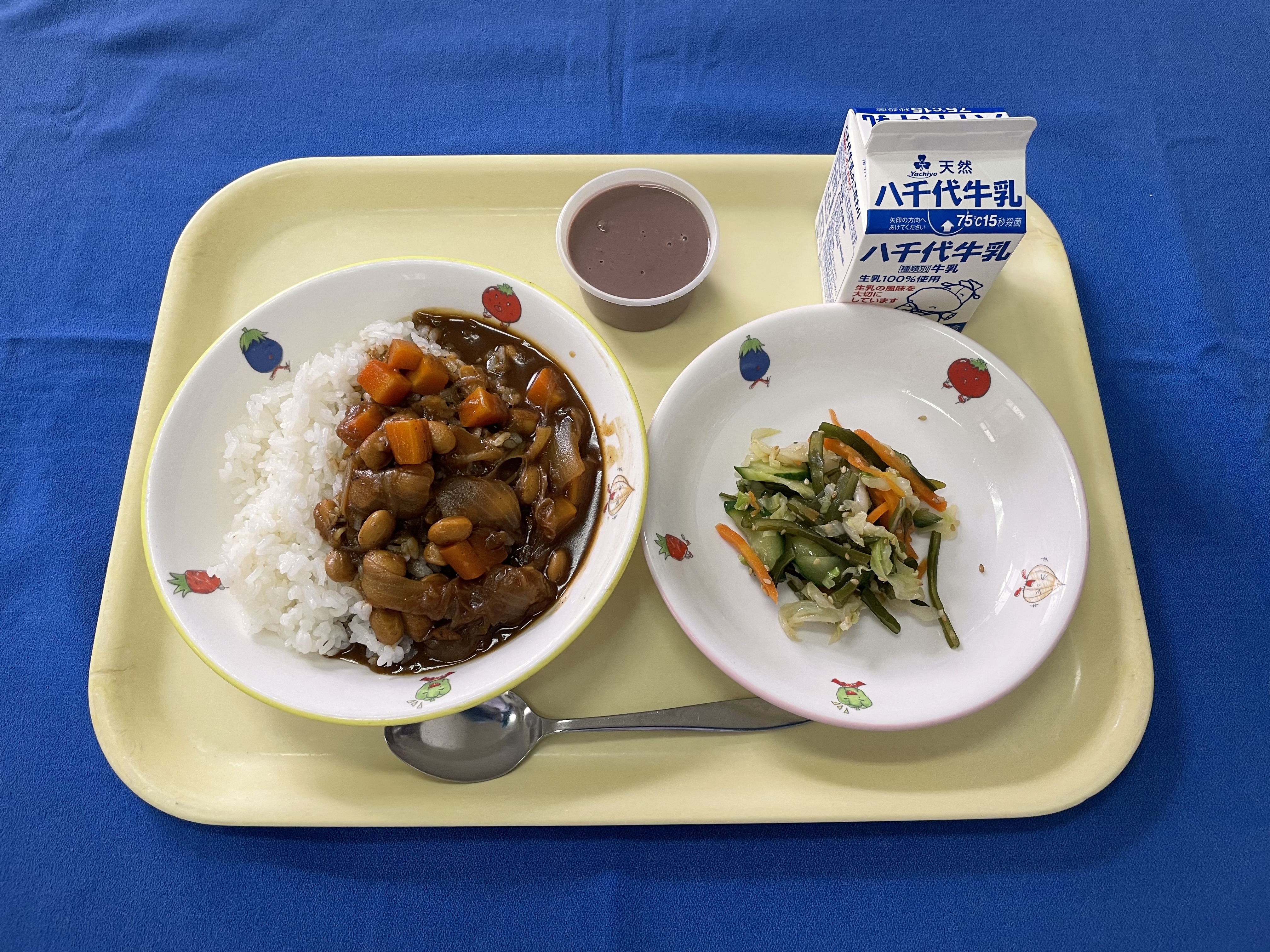 麦ご飯 ビーンズカレー 茎わかめのサラダ ココアプリン 牛乳 |