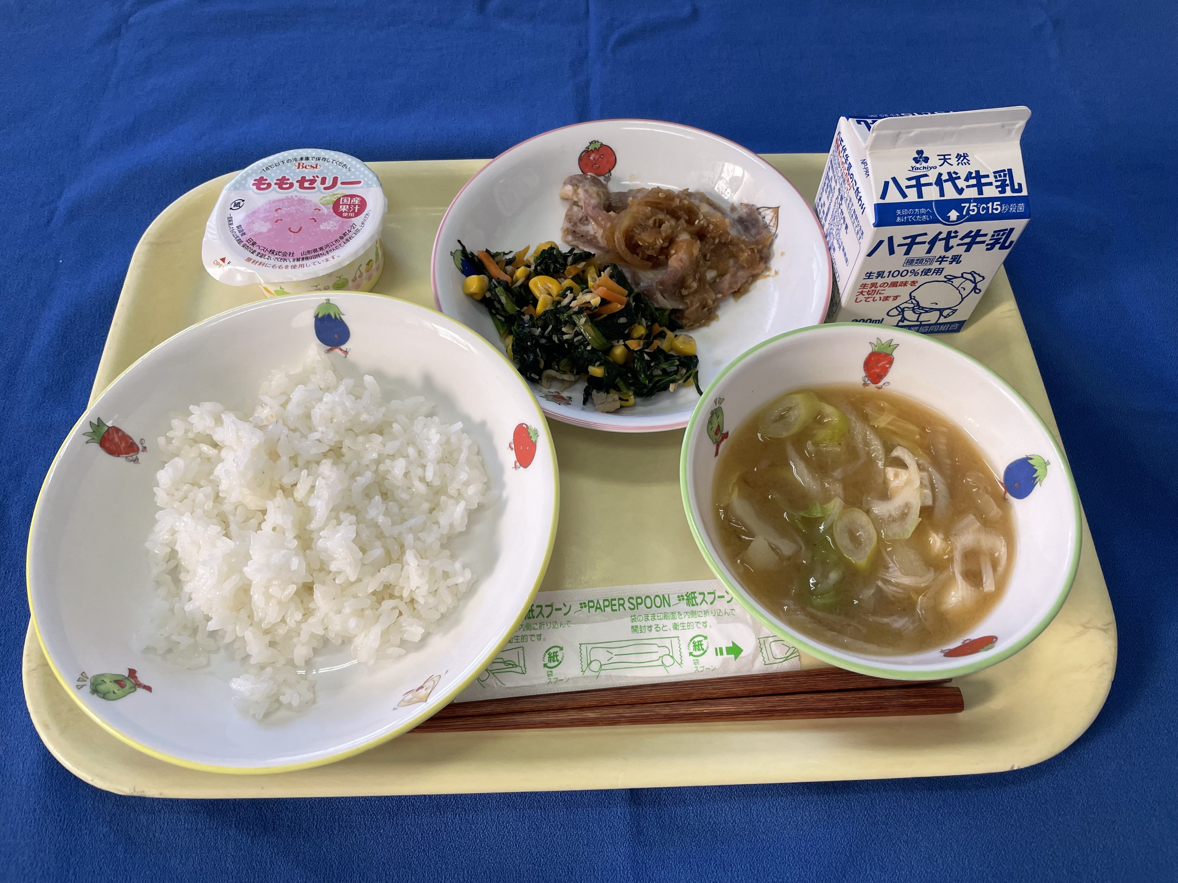 ご飯 トンテキ玉ねぎソース ほうれん草とコーンのソテー ピリ辛味噌汁 桃ゼリー 牛乳 |
