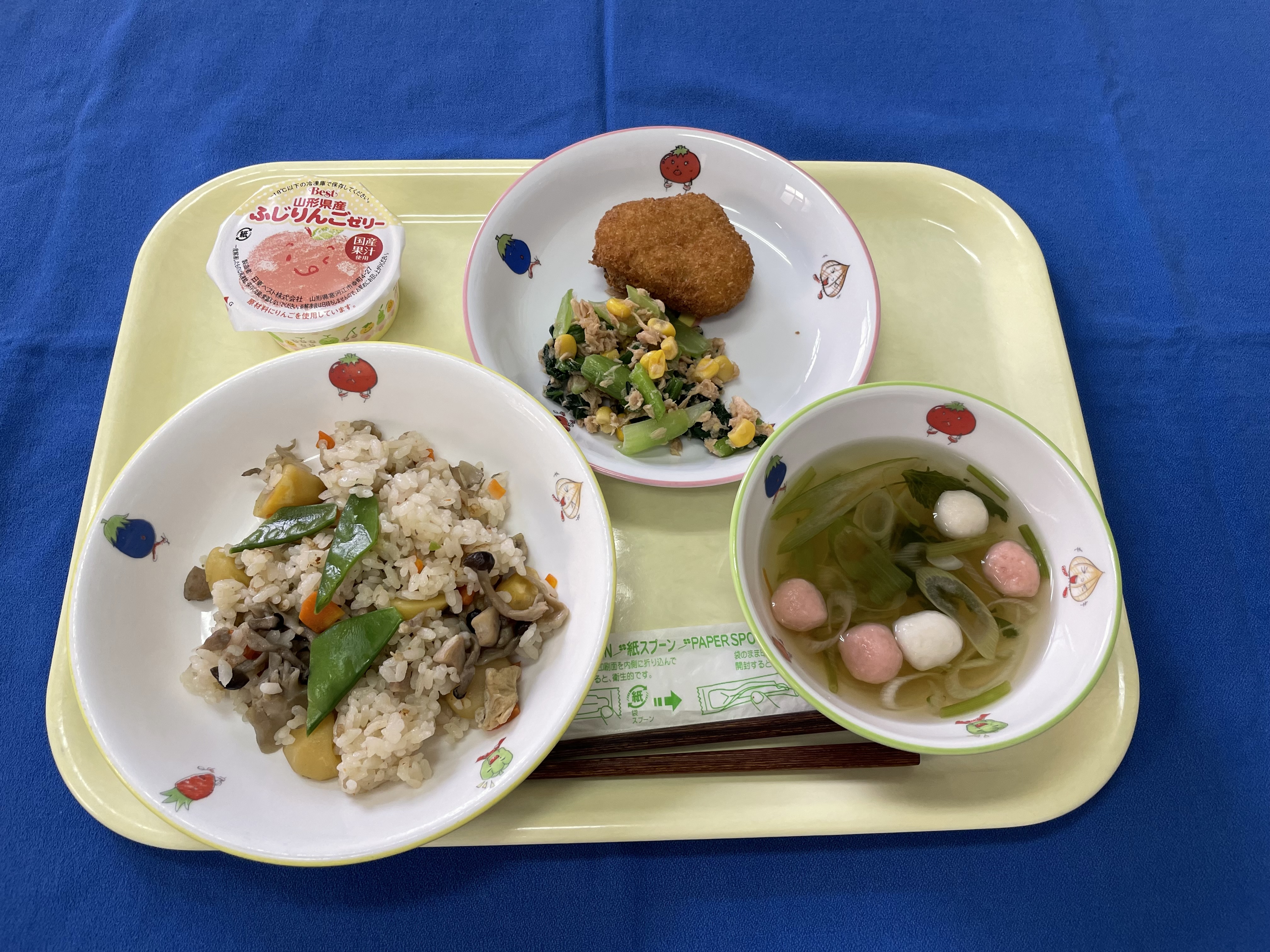 【十三夜献立】 実りの秋のご飯 焼き栗コロッケ 小松菜のツナ和え すまし汁 りんごゼリー 牛乳 |
