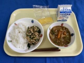 牛乳 ご飯 生揚げのカレー煮込み 納豆和え 冷凍パイン |