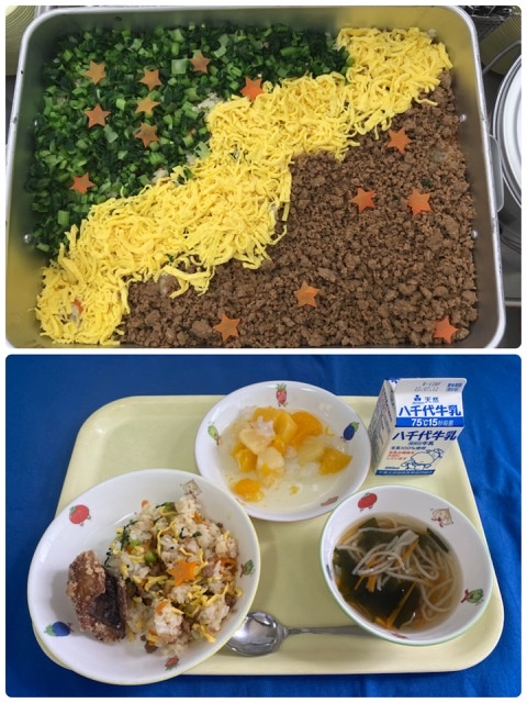 <端午の節句献立> 牛乳 中華おこわ ひじき入り卵焼き 小松菜のすまし汁 柏餅 |